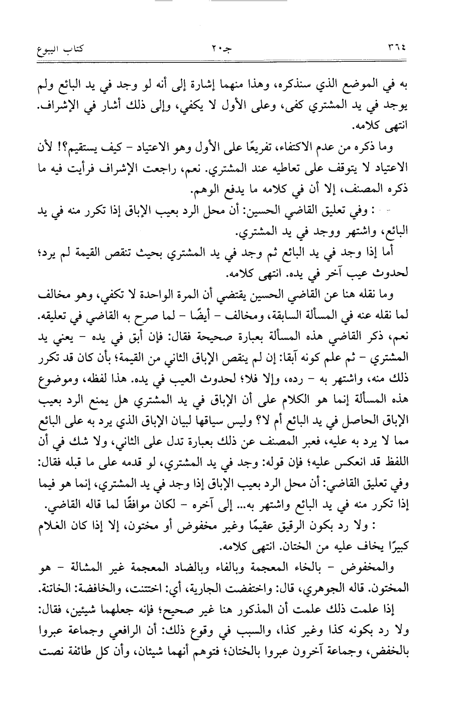 وما ذكره من عدم الاكتفاء، تفريعًا على الأول وهو الاعتياد- كيف يستقيم؟! لأن الاعتياد لا يتوقف على تعاطيه عند المشتري. نعم، راجعت الإشراف فرأيت فيه ما ذكره المصنف، إلا أن في كلامه ما يدفع الوهم.