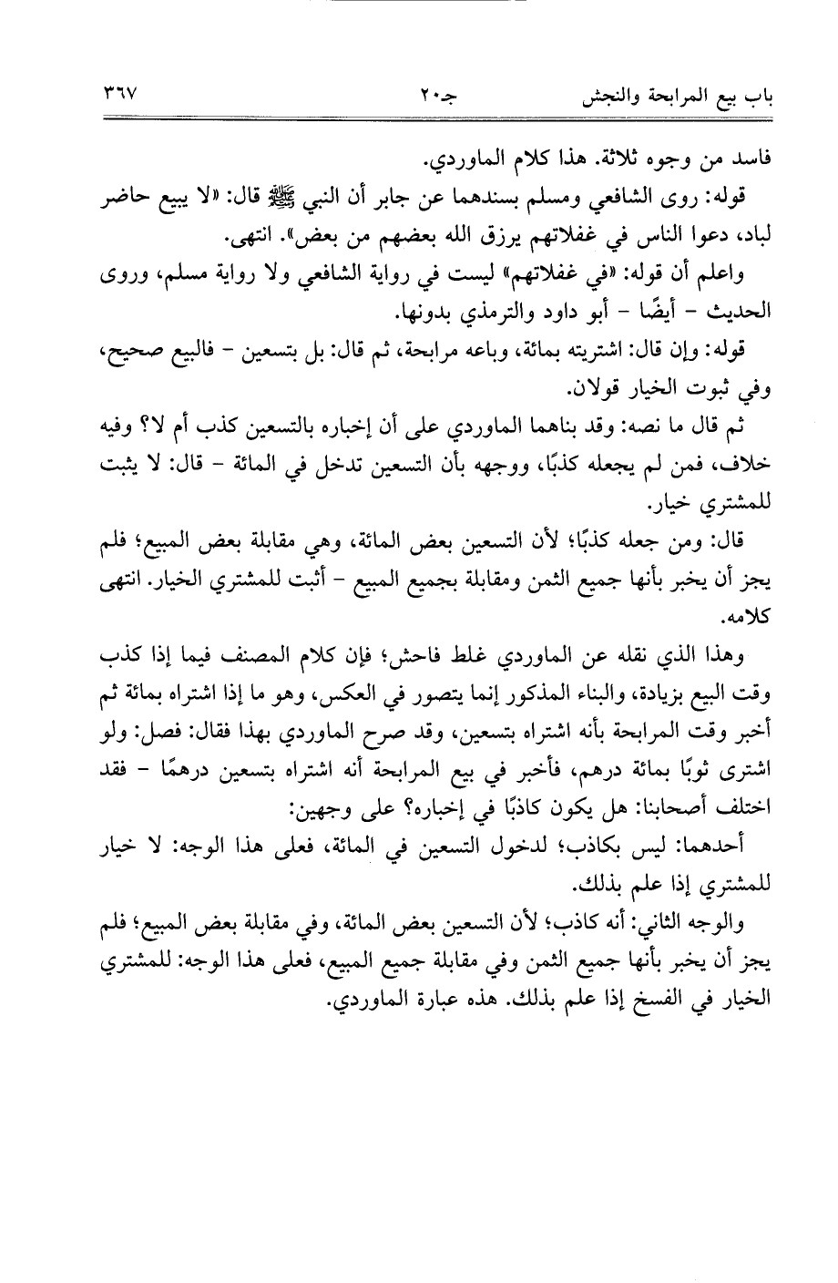 والوجه الثاني: أنه كاذب، لأن التسعين بعض المائة، وفي مقابلة بعض المبيع، فلم يجز أن يخبر بأنها جميع الثمن وفي مقابلة جميع المبيع، فعلى هذا الوجه: للمشتري الخيار في الفسخ إذا علم بذلك. هذه عبارة الماوردي.