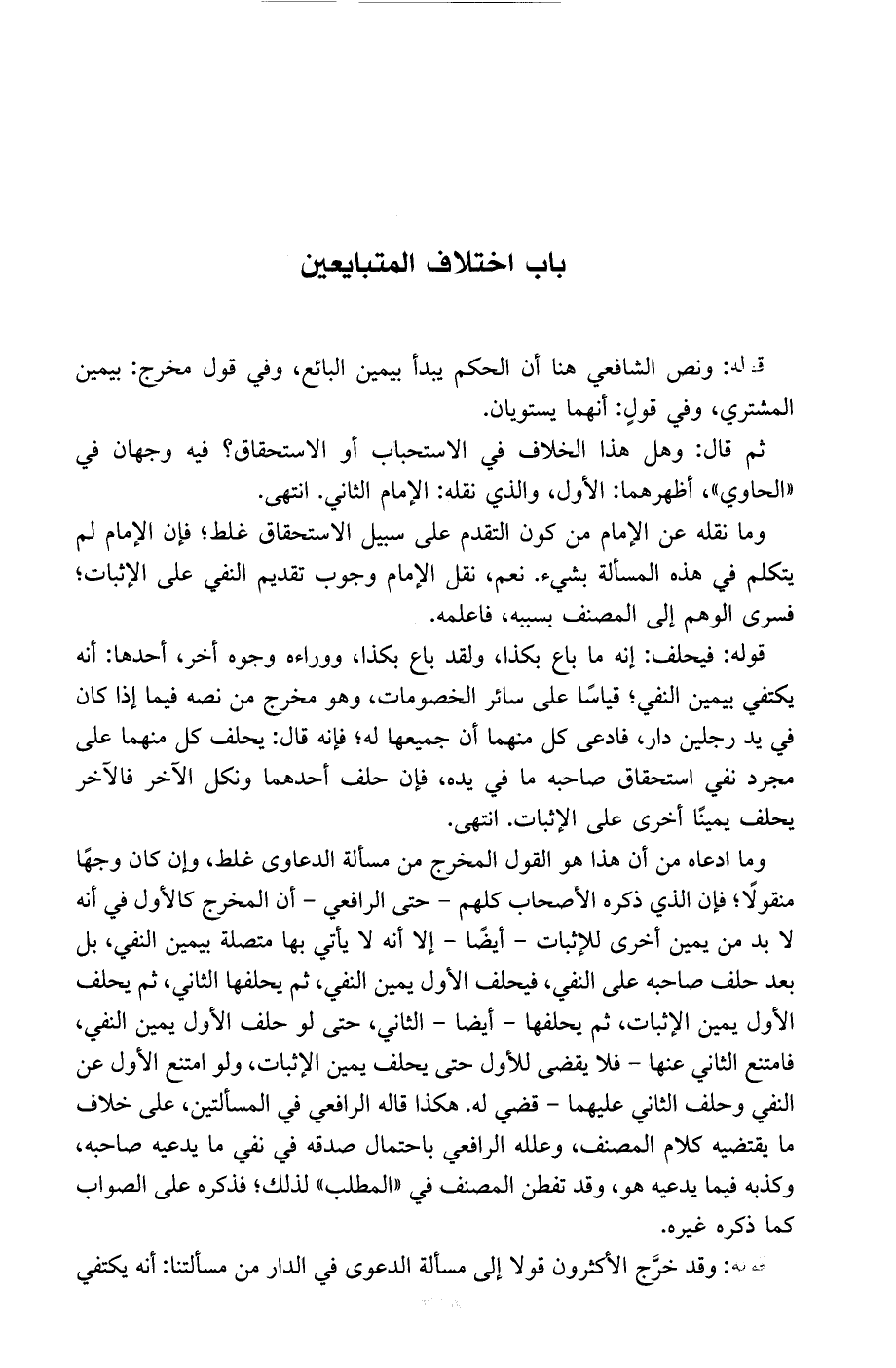 وما ادعاه من أن هذا هو القول المخرج من مسألة الدعاوى غلط، وإن كان وجهًا منقولًا، فإن الذي ذكره الأصحاب كلهم- حتى الرافعي- أن المخرج كالأول في أنه لابد من يمين أخرى للإثبات- أيضًا- إلا أنه لا يأتي بها متصلة بيمين النفي، بل بعد حلف صاحبه على النفي، فحلف الأول يمين النفي، ثم يحلفها الثاني، ثم يحلف الأول يمين الإثبات، ثم يحلفها- أيضًا- الثاني، حتى لو حلف الأول يمين النفي، فامتنع الثاني عنها- فلا يقضى للأول حتى يحلف يمين الإثبات، ولو امتنع الأول عن النفي وحلف الثاني عليهما- قضي له. هكذا قاله الرافعي في المسألتين، على خلاف ما يقتضيه كلام المصنف، وعلله الرافعي باحتمال صدقه في نفي ما يدعيه صاحبه، وكذبه في ما يدعيه هو، وقد تفطن المصنف في ((المطلب)) لذلك، فذكره على الصواب كما ذكره غيره.