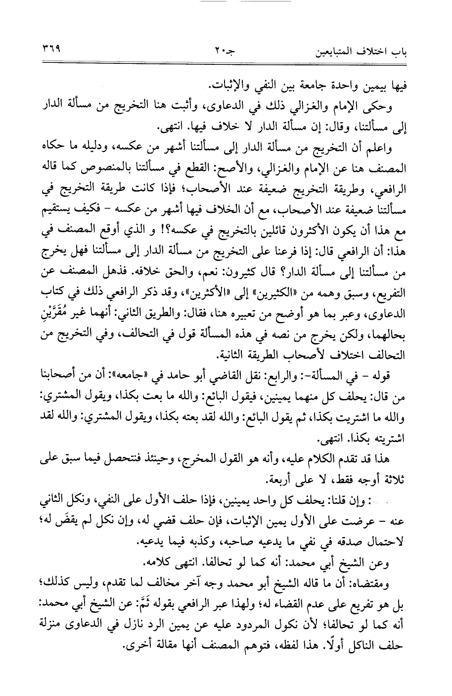 واعلم أن التخريج من مسألة الدار إلى مسألتنا أشهر من عكسه، ودليله ما حكاه المصنف هنا عن الإمام والغزالي، والأصح: القطع في مسألتنا بالمنصوص كما قاله الرافعي، وطريقة التخريج ضعيفة عند الأصحاب، فإذا كانت التخريج في مسألتنا ضعيفة عند الأصحاب، مع أن الخلاف فيها أشهر من عكسه- فكيف يستقيم مع هذا أن يكون الأكثرون قائلين بالتخريج في عكسه؟! والذي أوقع المصنف في هذا: أن الرافعي قال: إذا فرعنا على التخريج من مسألة الدار إلى مسألتنا فهل يخرج من مسألتنا إلى مسألة الدار؟ قال كثيرون: نعم، والحق خلافه. فذهل المصنف عن التفريع، وسبق وهمه من ((الكثيرين)) إلى ((الأكثرين))، وقد ذكر الرافعي ذلك في كتاب الدعاوى، وعبر بما هو أوضح من تعبيره هنا، فقال: والطريق الثاني: أنهما غير مقرين بحالهما، ولكن يخرج من نصه في هذه المسألة قول في التحالف، وفي التخريج من التحالف اختلاف لأصحاب الطريقة الثانية.