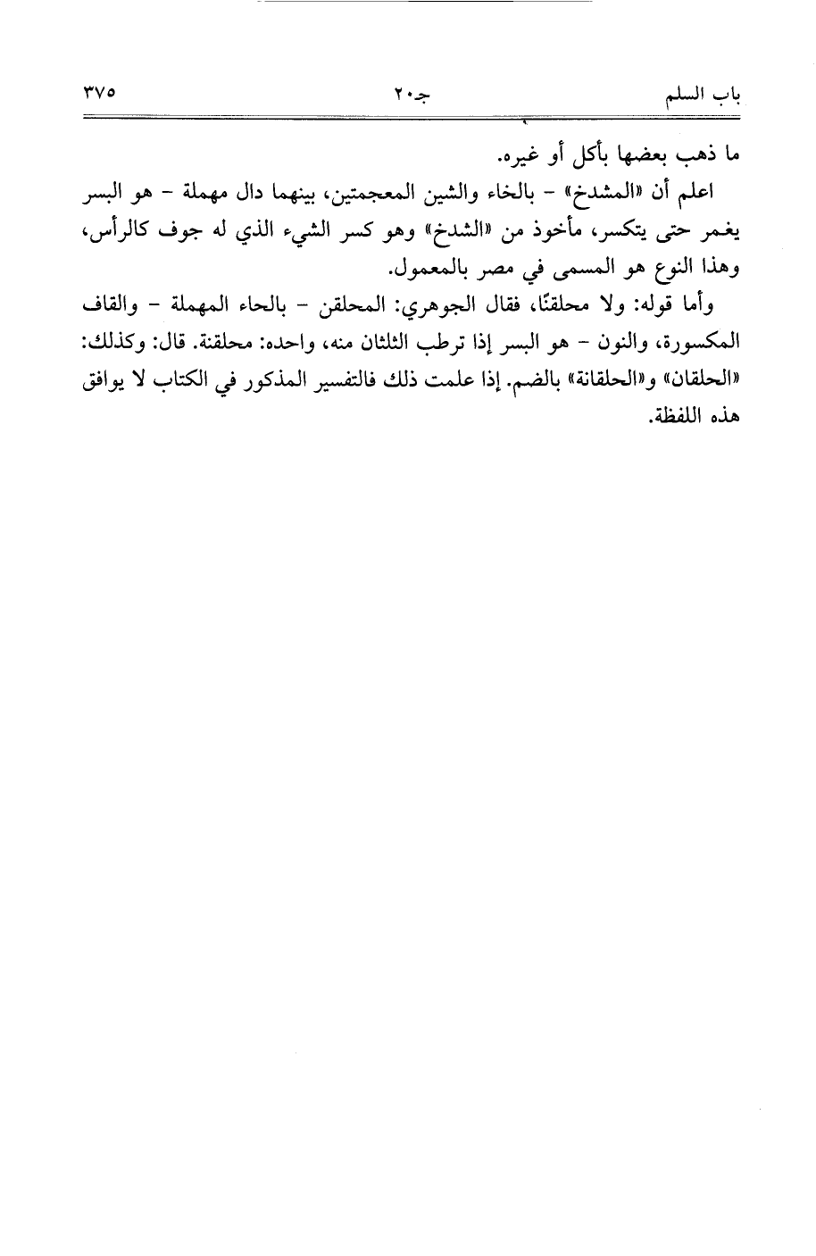 وأما قوله: ولا محلقنًا، فقال الجوهري: المحلقن- بالحاء المهملة- والقاف المكسورة، والنون- هو البسر إذا ترطب الثلثان منه، واحدة: محلقنة. قال: وكذلك: ((الحلقان)) و ((الحلقانة)) بالضم. إذا علمت ذلك فالتفسير المذكور في الكتاب لا يوافق هذه اللفظة.