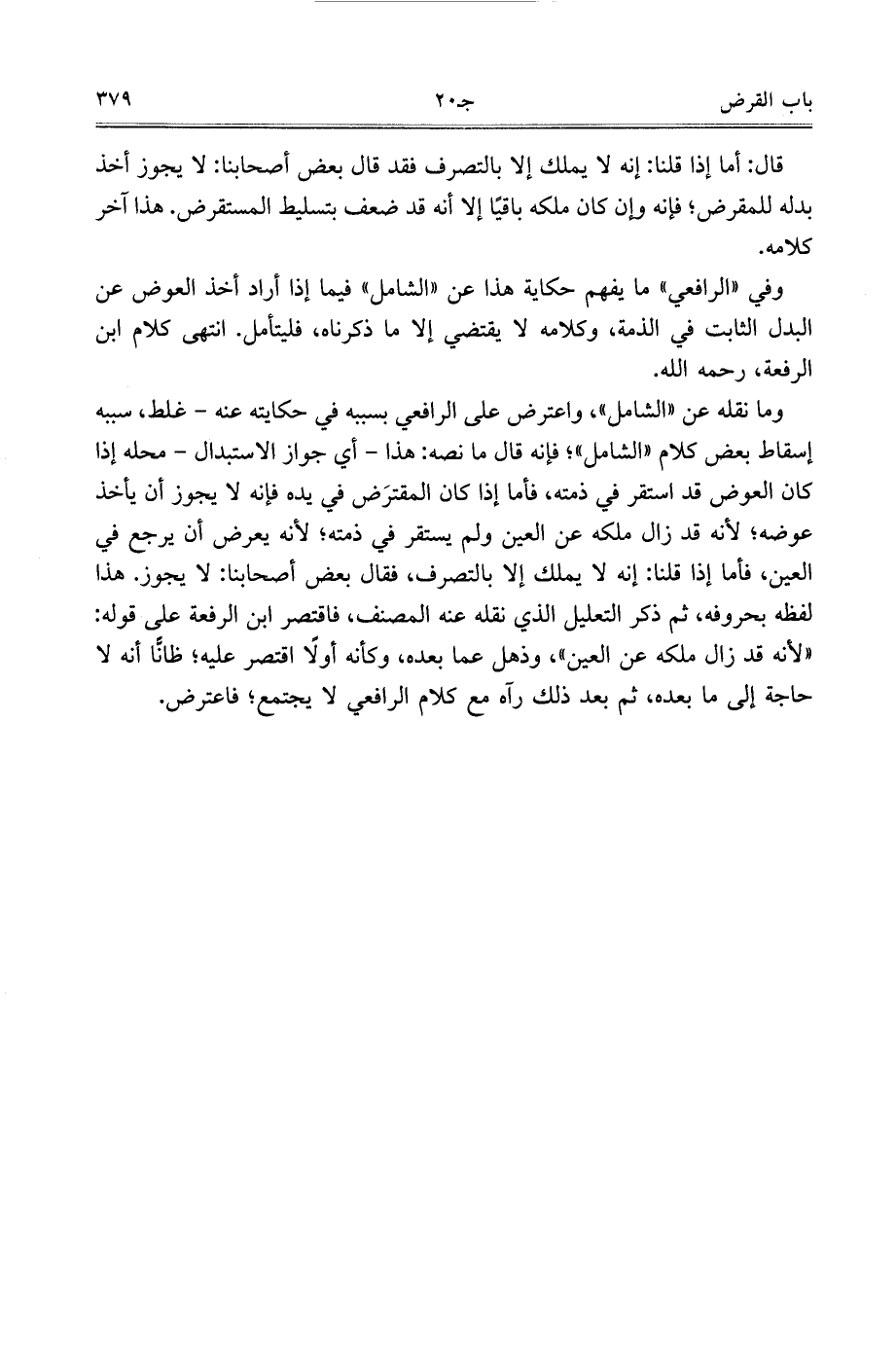 وما نقله عن ((الشامل))، واعترض على الرافعي بسببه في حكايته عنه- غلط، سببه إسقاط بعض كلام ((الشامل))، فإنه قال ما نصه: هذا- أي جواز الاستبدال- محله إذا كان العوض قد استقر في ذمته، فأما إذا كان المقترض في يده فإنه لا يجوز أن يأخذ عوضه، لأنه قد زال ملكه عن العين ولم يستقر في ذمته، لأنه يعرض أن يرجع في العي، فأما إذا قلنا: إنه لا يملك إلا بالتصرف، فقال بعض أصحابنا: لا يجوز. هذا لفظه بحروفه، ثم ذكر التعليل الذي نقله عنه المصنف، فاقتصر ابن الرفعة على قوله: ((لأنه قد زال ملكه عن العين))، وذهل عما بعده، وكأنه أولًا اقتصر عليه، ظانًا أنه لا حاجة إلى ما بعده، ثم بعد ذلك رآه مع كلام الرافعي لا يجتمع، فاعترض.