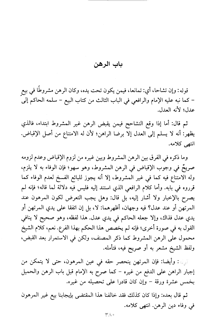 قوله: وأيضًا: فإن المرتهن ينحصر حقه في عين المرهون، حتى لا يتمكن من إجبار الراهن على الدفع من غيره- كما صرح به الإمام قبل باب الرهن والحميل بخمس عشرة ورقة- وإن كان قادرًا على تحصيله من غيره.