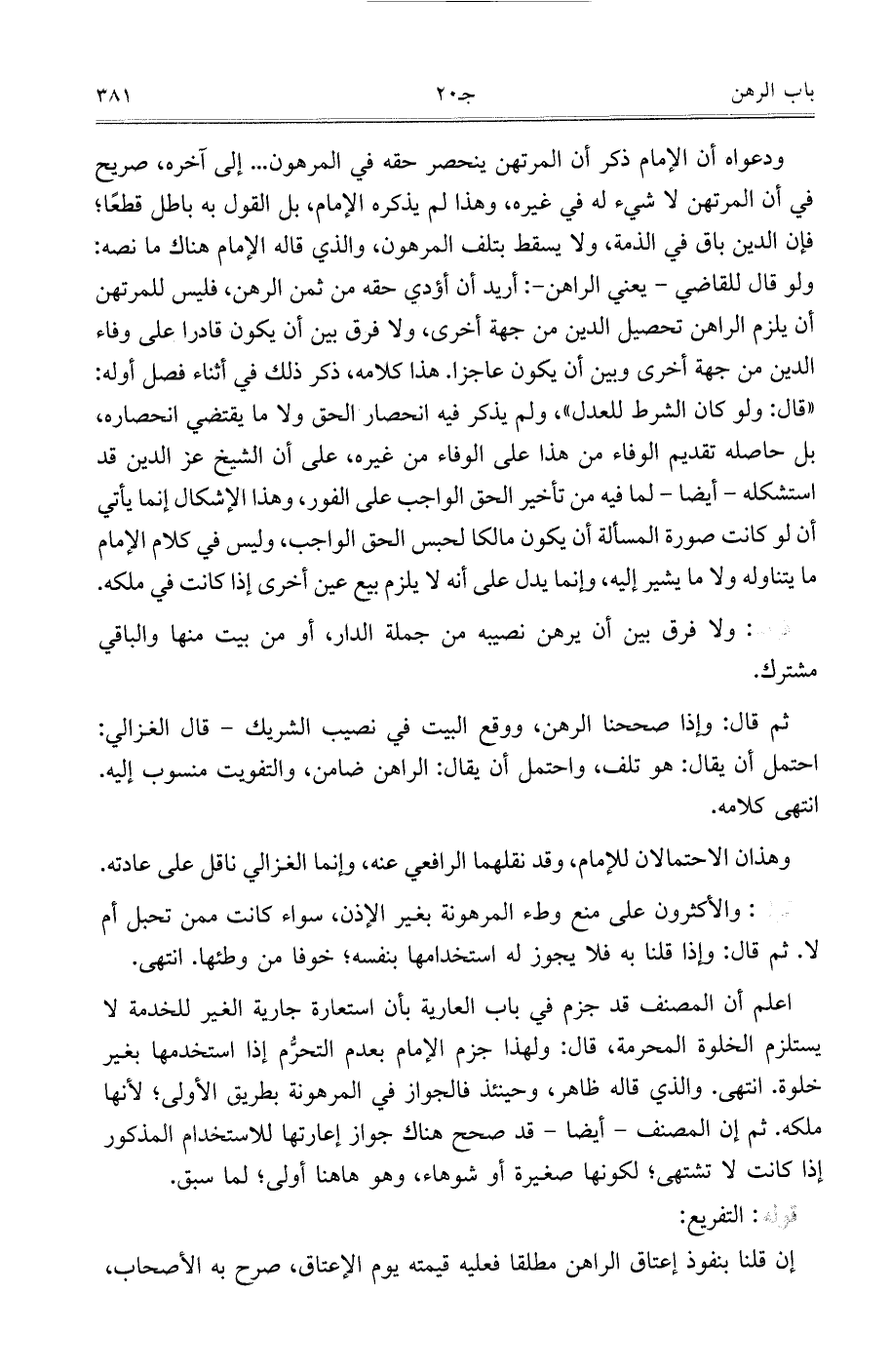 ودعواه أن الإمام ذكر أ، المرتهن ينحصر حقه في المرهون ... إلى آخره، صريح في أن المرتهن لا شيء له في غيره، وهذا لم يذكره الإمام، بل القول به باطل قطعًا، فإن الدين باق في الذمة، ولا يسقط بتلف المرهون، والذي قاله هناك ما نصه: ولو قال للقاضي- يعني الراهن-: أريد أن أؤدي حقه من ثمن الرهن، فليس للمرتهن أن يلزم الراهن تحصيل الدين من جهة أخرى، ولا فرق بين أن يكون قادرًا على وفاء الدين من جهة أخرى وبين أن يكون عاجزًا. هذا كلامه، ذكر ذلك في أثناء فصل أوله: ((قال: ولو كان الشرط للعدل))، ولم يذكر فيه انحصار الحق ولا ما يقتضي انحصاره، بل حاصله تقديم الوفاء من هذا على الوفاء من غيره، على أن الشيخ عز الدين قد استشكله- أيضًا- لما فيه من تأخير الحق الواجب على الفور، وهذا الإشكال إنما يأتي أن لو كانت صورة المسألة أن يكون مالكًا لحبس الحق الواجب، وليس في كلام الإمام ما يتناوله ولا ما يشير إليه، وإنما يدل على أنه لا يلزم بيع عين أخرى إذا كانت في ملكه.