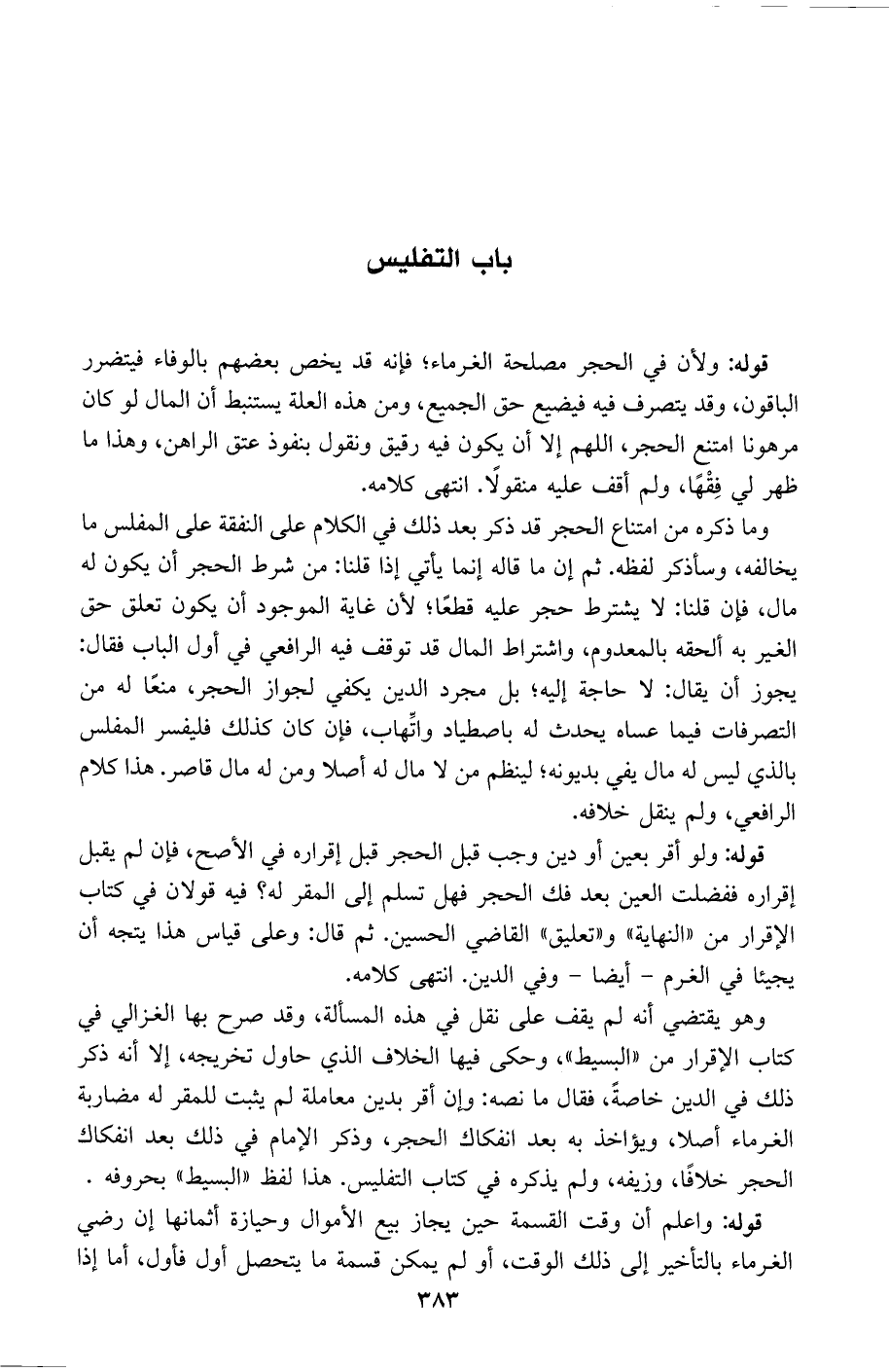 قوله: ولأن في الحجر مصلحة الغرماء، فإنه قد يخص بعضهم بالوفاء فيتضرر الباقون، وقد يتصرف فيه فيضيع حق الجميع، ومن هذه العلة يستنبط أن المال لو كان مرهونًا امتنع الحجر، اللهم إلا أن يكون فيه رقيق ونقول بنفوذ عتق الراهن، وهذا ما ظهر لي فقهًا، ولم أقف عليه منقولًا. انتهى كلامه.