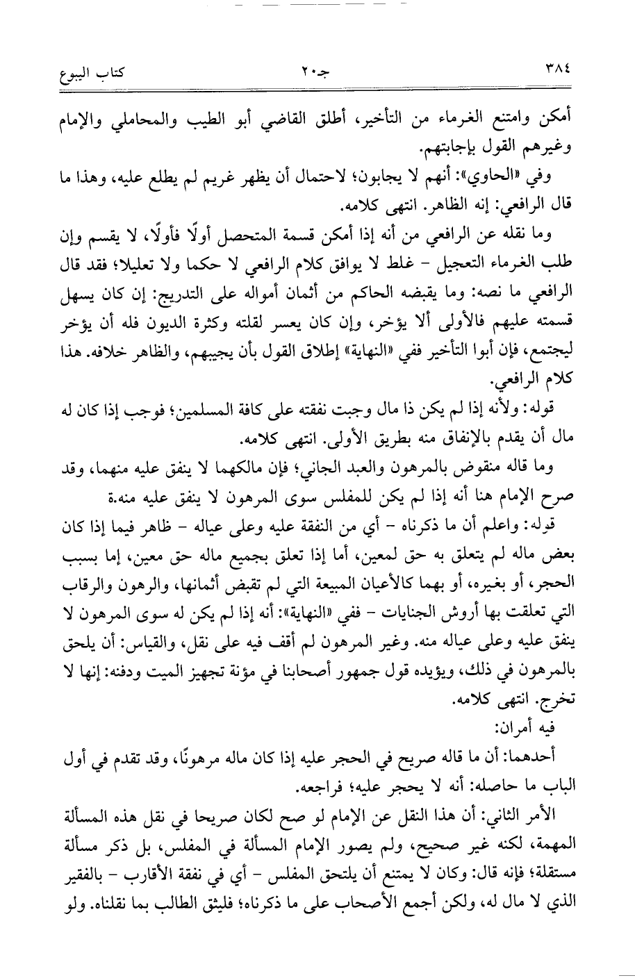 الأمر الثاني: أن هذا النقل عن الإمام لو صح لكان صريحًا في نقل هذه المسألة المهمة، لكنه غير صحيح، ولم يصور الإمام المسألة في المفلس، بل ذكر مسألة مستقلة، فإنه قال: وكان لا يمتنع أن يلتحق المفلس- أي في نفقة الأقارب- بالفقير الذي لا مال له، ولكن أصحاب على ما ذكرناه، فليثق الطالب بما نقلناه. ولو