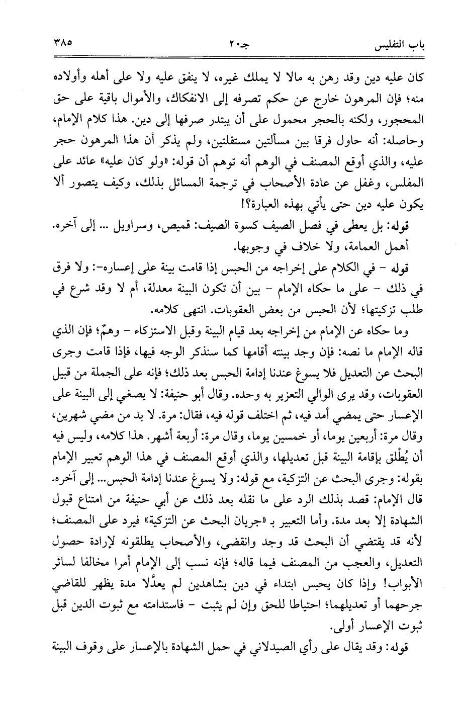 وما حكاه عن الإمام من إخراجه بعد قيام البينة وقبل الاستزكاء- وهمٌ، فإن الذي قاله الإمام ما نصه: فإن وجد بينته أقامها كما سنذكر الوجه فيها، فإذا قامت وجرى البحث عن التعديل فلا يسوغ عندنا إدامة الحبس بعد ذلك، فإنه على الجملة من قبيل العقوبات، وقد يرى الوالي التعزير به وحده. وقال أبو حنيفة: لا يصغي إلى البينة على الإعسار حتى يمضي أمد فيه، ثم اختلف قوله فيه، فقال: مرة. لابد من مضي شهرين، وقال مرة: أربعين يومًا، أو خمسين يومًا، وقال مرة: أربعة أشهر. هذا كلامه، وليس فيه أن يطلق بإقامة البينة قبل تعديلها، والذي أوقع المصنف في هذا الوهم تعبير الإمام بقوله: وجرى البحث عن التزكية، مع قوله: ولا يسوغ عندنا إدامة الحبس ... إلى آخره. قال الإمام: قصد بذلك الرد على ما نقله بعد ذلك عن أبي حنيفة من امتناع قبول الشهادة إلا بعد مدة. وأما التعبير بـ ((جريان البحث عن التزكية)) فيرد على المصنف، لأنه قد يقتضي أن البحث قد وجد وانقضى، والأصحاب يطلقونه لإرادة حصول التعديل، والعجب من المصنف فيما قاله، فإنه نسب إلى الإمام أمرًا مخالفًا لسائر الأبواب! وإذا كان يحبس ابتداء في دين بشاهدين لم يعدلا مدة يظهر للقاضي جرحهما أو تعديلهما، احتياطًا للحق وإن لم يثبت- فاستدامته مع ثبوت الدين قبل ثبوت الإعسار أولى.