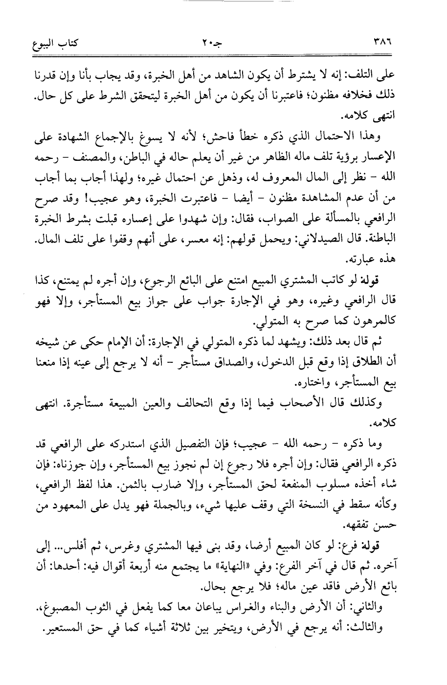 وما ذكره- رحمه الله- عجيب، فإن التفصيل الذي استدركه على الرافعي قد ذكره الرافعي فقال: وإن أجره فلا رجوع إن لم نجوز بيع المستأجر، وإن جوزناه: فإن شاء أخذه مسلوب المنفعة لحق المستأجر، وإلا ضارب بالثمن. هذا لفظ الرافعي، وكأنه سقط في النسخة التي وقف عليها شيء، وبالجملة فهو يدل على المعهود من حسن تفقهه.