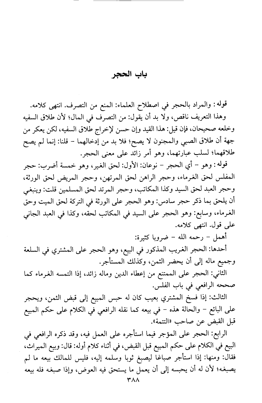 قوله: وهو- أي الحجر- نوعان: الأول: لحق الغير، وهو خمسة أضرب: حجر المفلس لحق الغرماء، وحجر الراهن لحق المرتهن، وحجر المريض لحق الورثة، وحجر العبد لحق السيد وكذا المكاتب، وحجر المرتد لحق المسلمين قلت: وينبغي أن يلحق بما ذكر حجر سادس: وهو الحجر على الورثة في التركة لحق الميت وحق الغرماء، وسابع: وهو الحجر على السيد في المكاتب لحقه، وكذا في العبد الجاني على قول. انتهى كلامه.