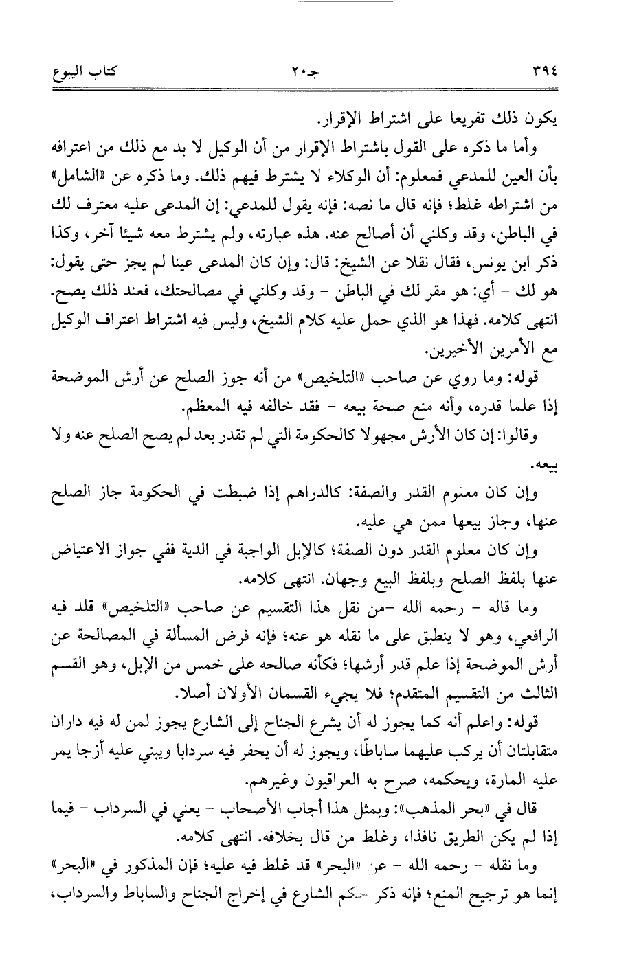 وأما ما ذكره على القول باشتراط الإقرار من أن الوكيل لابد مع ذلك من اعترافه بأن العين للمدعي فمعلوم: أن الوكلاء لا يشترط فيهم ذلك. وما ذكره عن ((الشامل)) من اشتراطه غلط، فإنه قال ما نصه: فإنه يقول للمدعي: إن المدعى عليه معترف لك في الباطن، وقد وكلني أن أصالح عنه. هذه عبارته، ولم يشترط معه شيئًا آخر، وكذا ذكر ابن يونس، فقال نقلًا عن الشيخ: قال: وإن كان المدعى عينًا لم يجز حتى يقول: هو لك- أي: هو مقر لك في الباطن- وقد وكلني في مصالحتك، فعند ذلك يصح. انتهى كلامه. فهذا هو الذي حمل عليه كلام الشيخ، وليس فيه اشتراط اعتراف الوكيل مع الأمرين الأخيرين.