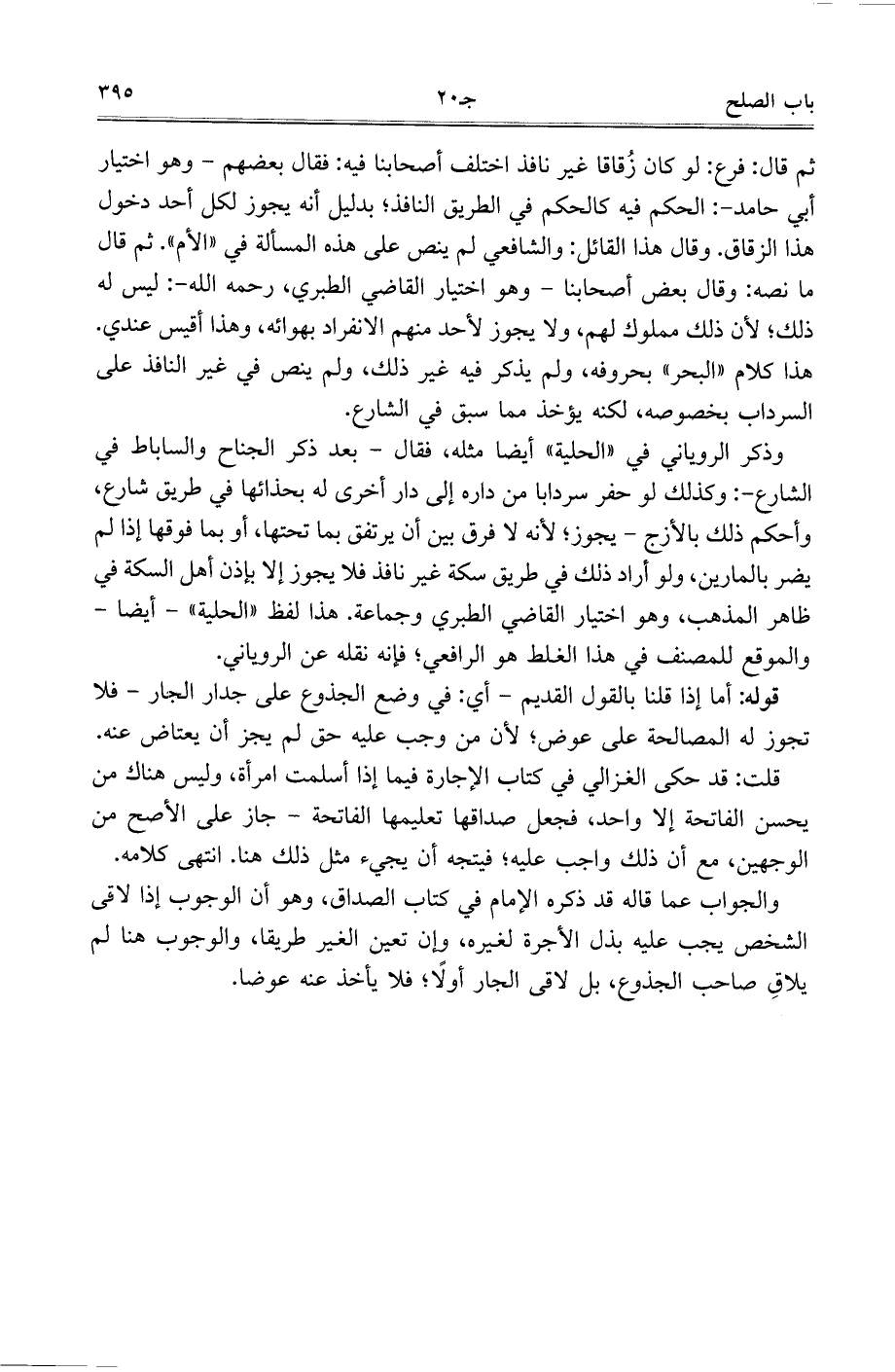 وذكر الروياني في ((الحلية)) أيضًا مثله، فقال- بعد ذكر الجناح والساباط في الشارع-: وكذلك لو حفر سردابًا من داره إلى دار أخرى له بحذائها في طريق شارع، وأحكم ذلك بالأزج- يجوز، لأنه لا فرق بين أن يرتفق بما تحتها، أو بما فوقها إذا لم يضر بالمارين، ولو أراد ذلك في طريق سكة غير نافذ فلا يجوز إلا بإذن أهل السكة في ظاهر المذهب، وهو اختيار القاضي الطبري وجماعة. هذا لفظ ((الحلية)) - أيضًا- والموقع للمصنف في هذا الغلط هو الرافعي، فإنه نقله عن الروياني.