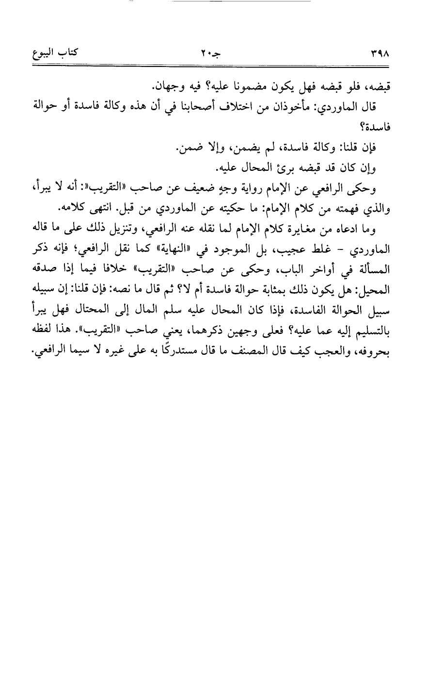 وما ادعاه من مغايرة كلام الإمام لما نقله عنه الرافعي، وتنزيل ذلك على ما قاله الماوردي- غلط عجيب، بل الموجوج في ((النهاية)) كما نقل الرافعي، فإنه ذكر المسألة في أواخر الباب، وحكى عن صاحب ((التقريب)) خلافًا فيما إذا صدقه المحيل: هل يكون ذلك بمثابة حوالة فاسدة أم لا؟ ثم قال ما نصه: فإن قلنا: إن سبيله سبيل الحوالة الفاسدة، فإذا كان المحال عليه سلم المال إلى المحتال فهل يبرأ بالتسليم إليه عما عليه؟ فعلى وجهين ذكرهما، يعني صاحب ((التقريب)). هذا لفظه بحروفه، والعجب كيف قال المصنف ما قال مستدركًا به على غيره لا سيما الرافعي.
