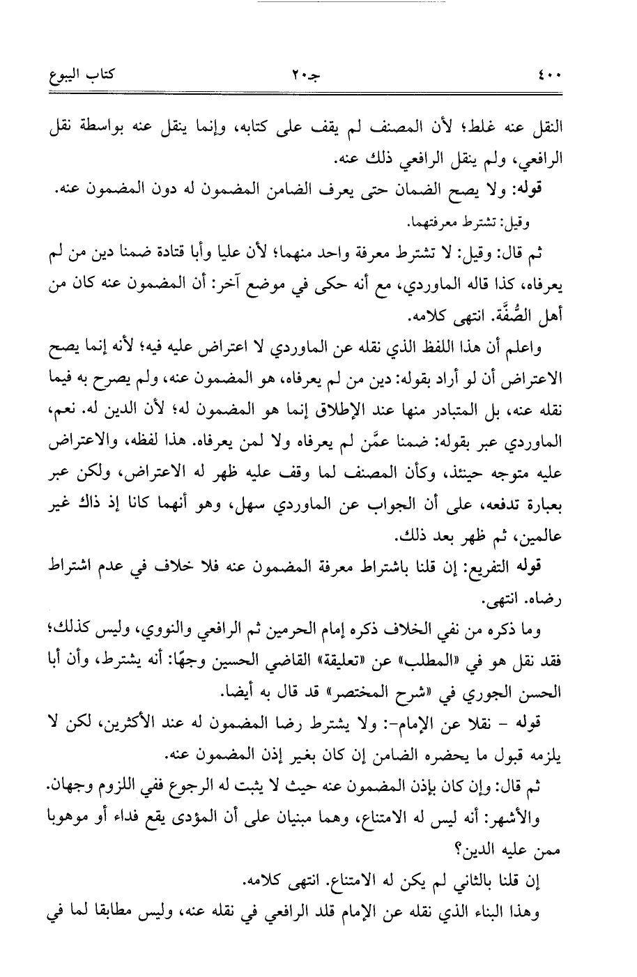 واعلم أن هذه اللفظ الذي نقله عن الماوردي لا اعتراض عليه فيه، لأنه إنما يصح الاعتراض أن لو أراد بقوله: دين من لم يعرفاه، هو المضمون عنه، ولم يصرح به فيما نقله عنه، بل المتبادر منها عند الإطلاق إنما هو المضمون له، لأن الدين له. نعم، الماوردي عبر بقوله: ضمنا عمن لم يعرفاه ولا لمن يعرفاه. هذا لفظه، والاعتراض عليه متوجد حينئذ، وكأن المصنف لما وقف عليه ظهر له الاعتراض، ولكن عبر بعبارة تدفعه، على أن الجواب عن الماوردي سهل، وهو أنهما كانا إذ ذاك غير عالمين، ثم ظهر بعد ذلك.