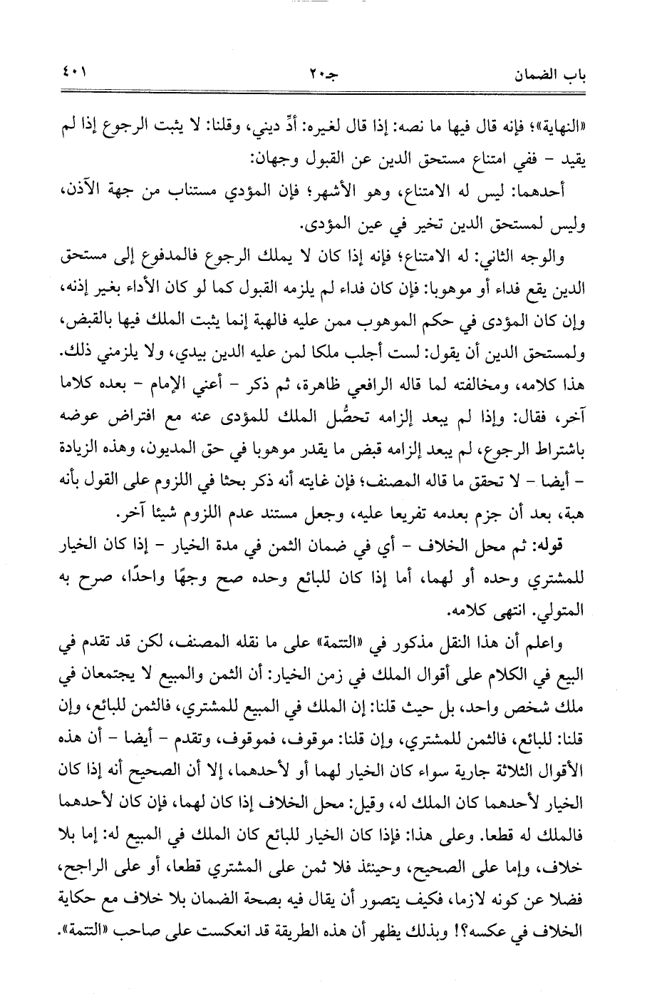 واعلم أن هذا النقل مذكور في ((التتمة)) على ما نقله المصنف، لكن قد تقدم في البيع في الكلام على أقوال الملك في زمن الخيار: أن الثمن والمبيع لا يجتمعان في ملك شخص واحد، بل حيث قلنا: إن الملك في المبيع للمشتري، فالثمن للبائع، وإن قلنا: للبائع، فالثمن للمشتري، وإن قلنا: موقوف، فموقوف، وتقدم- أيضًا- أن هذه الأقوال الثلاثة جارية سواء كان الخيار لهما أو لأحدهما، إلا أن الصحيح أنه إذا كان الخيار لأحدهما كان الملك له، وقيل: محل الخلاف إذا كان لهما، فإن كان لأحدهما فالملك له قطعا. وعلى هذا: فإذا كان الخيار للبائع كان الملك في المبيع له: إما بلا خلاف، وإما على الصحيح، وحينئذ فلا ثمن على المشتري قطعًا، أو على الراجح، فضلًا عن كونه لازمًا، فكيف يتصور أن يقال فيه بصحة الضمان بلا خلاف مع حكاية الخلاف في عكسه؟! وبذلك يظهر أن هذه الطريقة قد انعكست على صاحب ((التتمة)).