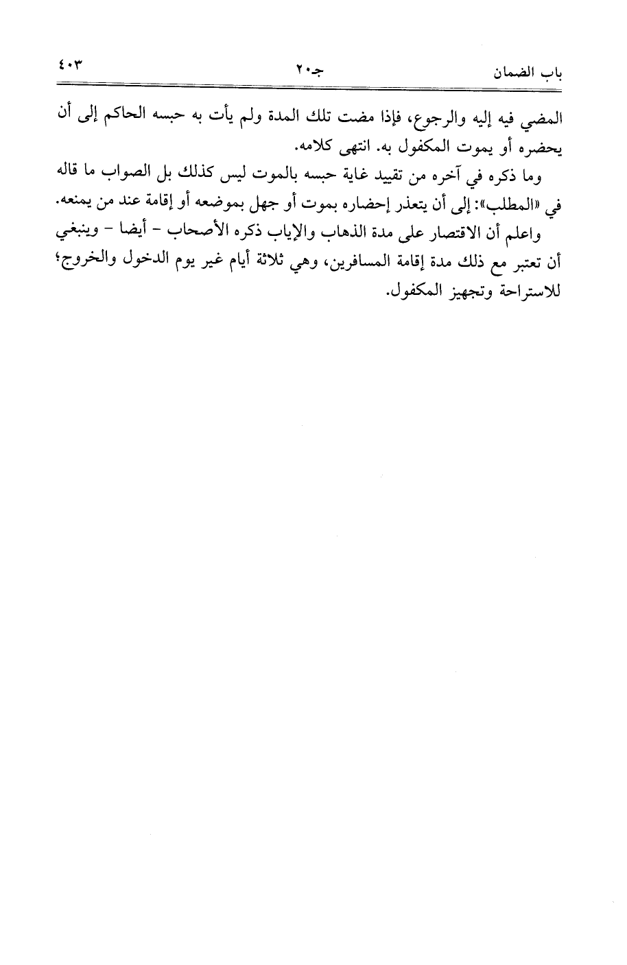 وما ذكره في آخره من تقييد غاية حبسه بالموت ليس كذلك بل الصواب ما قاله في ((المطلب)): إلى أن يتعذر إحضاره بموت أو جهل بموضعه أو إقامة عند من يمنعه.