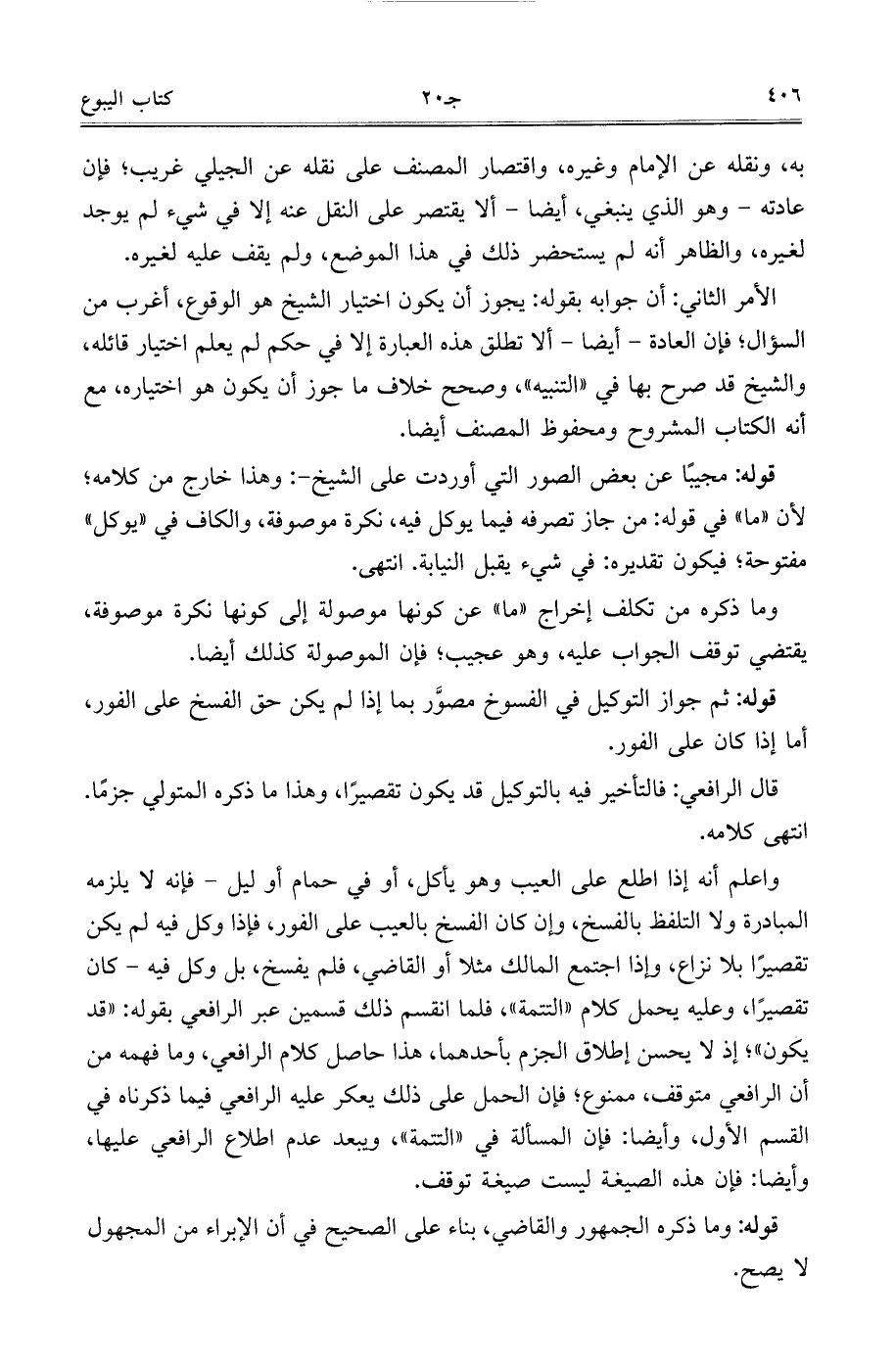 واعلم أن إذا اطلع على العيب وهو يأكل، أو في حمام أو ليل- فإنه لا يلزمه المبادرة ولا التلفظ بالفسخ، وإن كان الفسخ بالعيب على الفور، فإذا وكل فيه لم يكن تقصيرًا بلا نزاع، وإذا اجتمع المالك مثلًا أو القاضي، فلم يفسخ، بل وكل فيه- كان تقصيرًا، وعليه يحمل كلام ((التتمة))، فلما انقسم ذلك قسمين عبر الرافعي بقوله: ((قد يكون))، إذ لا يحسن إطلاق الجزم بأحدهما، هذا حاصل كلام الرافعي، وما فهمه من أن الرافعي متوقف، ممنوع، فإن الحمل على ذلك يعكر عليه الرافعي فيما ذكرناه في القسم الأول، وأيضًا: فإن المسألة في ((التتمة))، ويبعد عدم اطلاع الرافعي عليها، وأيضًا: فإن هذه الصيغة ليست صيغة توقف.