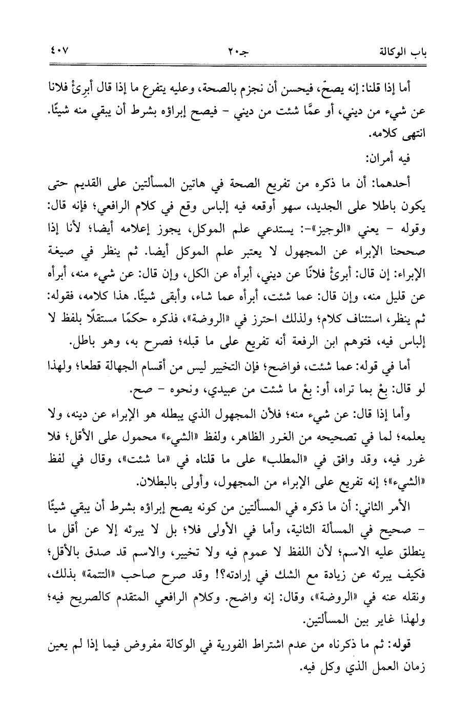 أحدهما: أن ما ذكره من تفريع الصحة في هاتين المسألتين على القديم حتى يكون باطلًا على الجديد، سهو أوقعه فيه إلباس وقع في كلام الرافعي، فإنه قال: وقوله- يعني ((الوجيز)) -: يستدعي علم الموكل، يجوز إعلامه أيضًا، لأنا إذا صححنا الإبراء عن المجهول لا يعتبر علم الموكل أيضًا. ثم ينظر في صيغة الإبراء: إن قال: أبرئ فلانًا عن ديني، أبرأه عن الكل، وإن قال: عن شيء منه، أبرأه عن قليل منه، وغن قال: عما شئت، أبرأه عما شاء، وأبقى شيئًا. هذا كلامه، فقوله: ثم ينظر، استئناف كلام، ولذلك احترز في ((الروضة))، فذكره حكمًا مستقلًا بلفظ لا إلباس فيه، فتوهم ابن الرفعة أنه تفريع على ما قبله، فصرح به، وهو باطل.