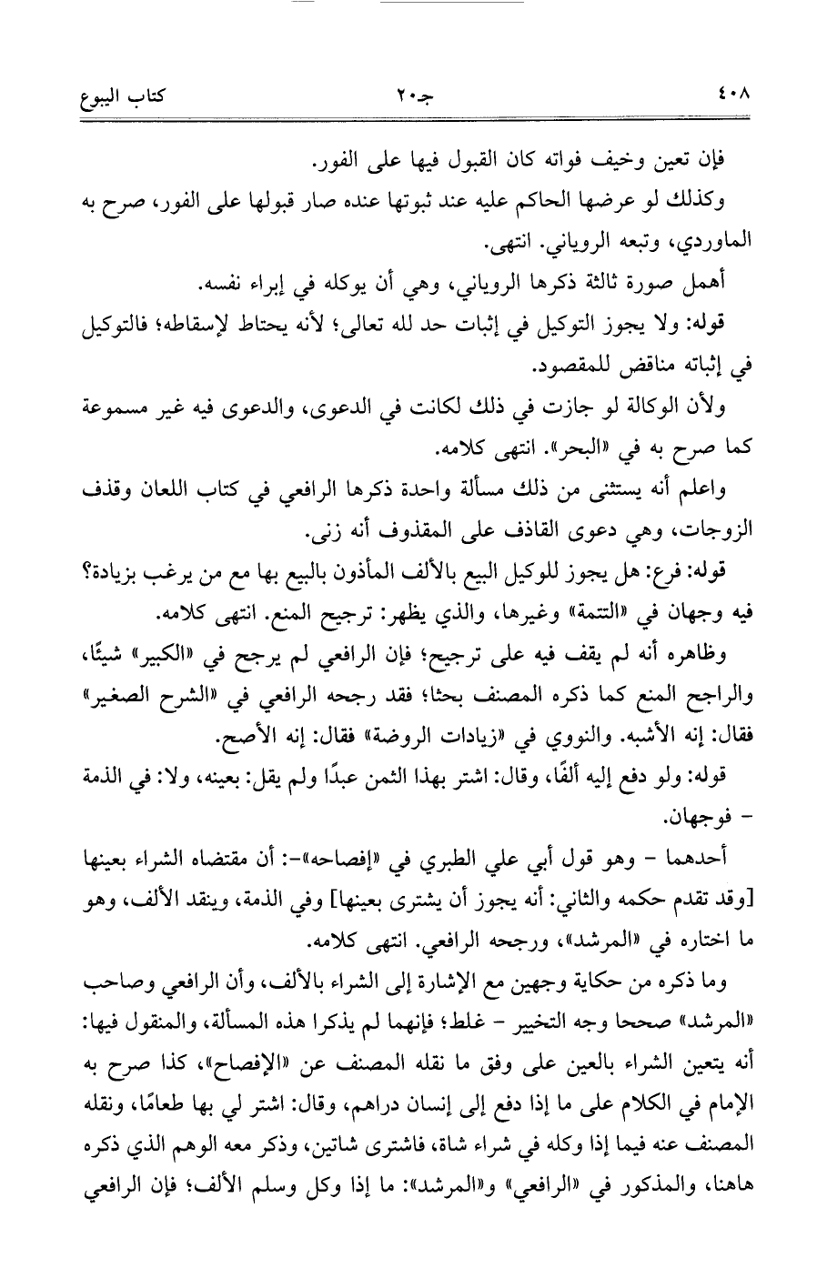 قوله: فرع: هل يجوز للوكيل البيع بالألف المأذون بالبيع بها مع من يرغب بزيادة؟ فيه وجهان في ((التتمة)) وغيرها، والذي يظهر: ترجيح المنع. انتهى كلامه.
