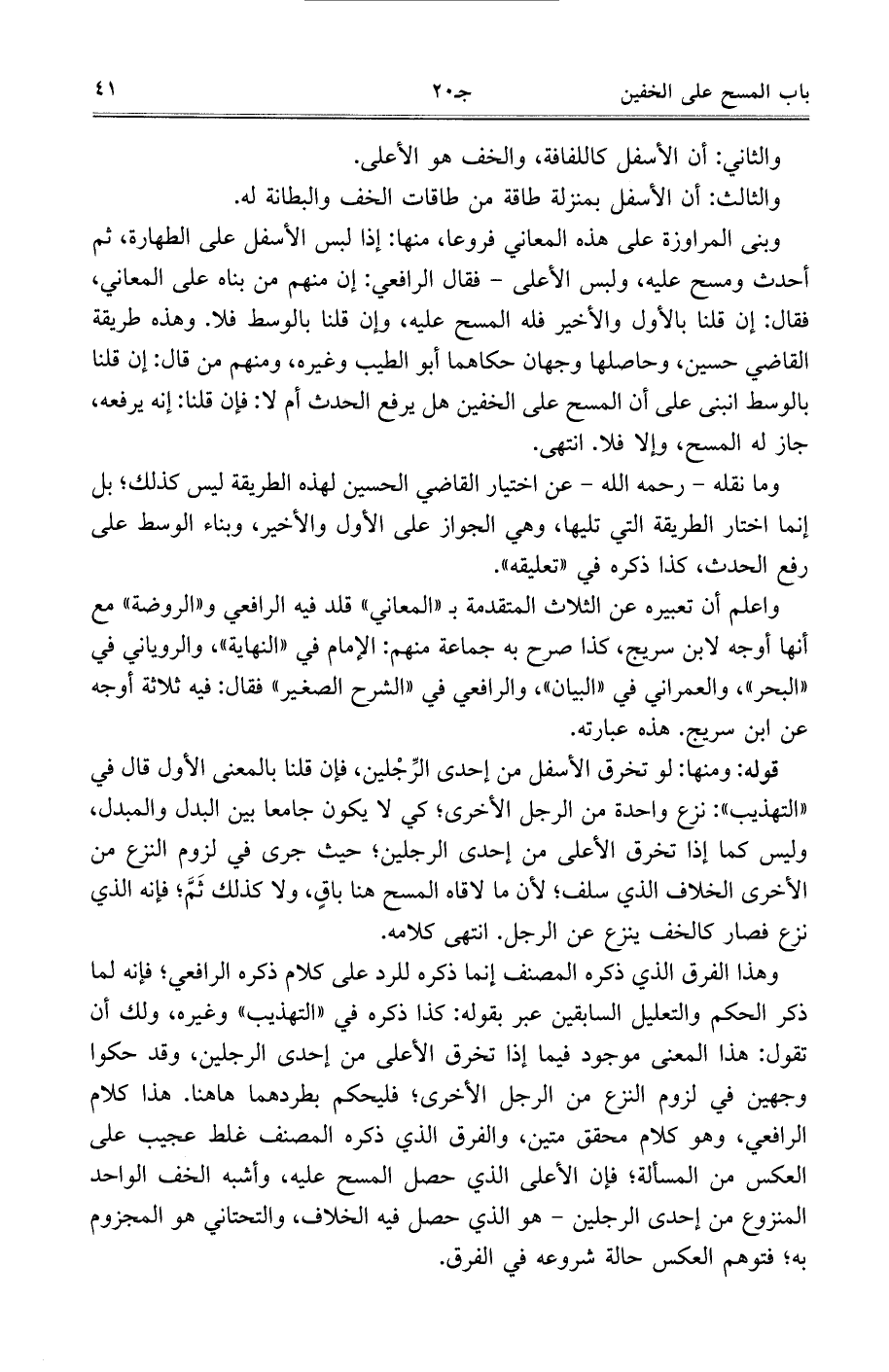 وهذا الفرق الذي ذكره المصنف إنما ذكره للرد على كلام ذكره الرافعي، فإنه لما ذكر الحكم والتعليل السابقين عبر بقوله: كذا ذكره في ((التهذيب)) وغيره، ولك أن تقول: هذا المعنى موجود فيما إذا تخرق الأعلى من إحدى الرجلين، وقد حكوا وجهين في لزوم النزع من الرجل الأخرى، فليحكم بطردهما هاهنا. هذا كلام الرافعي، وهو كلام محقق متين، والفرق الذي ذكره المصنف غلط عجيب على العكس من المسألة، فإن الأعلى الذي حصل المسح عليه، وأشبه الخف الواحد المنزوع من إحدى الرجلين- هو الذي حصل فيه الخلاف، والتحتاني هو المجزوم به، فتوهم العكس حالة شروعه في الفرق.