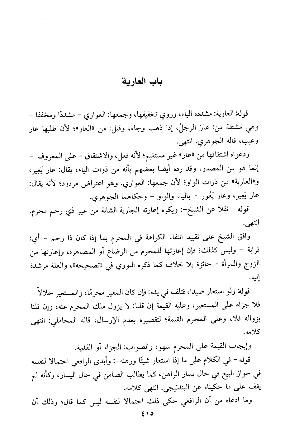 ودعواه اشتقاقها من ((عار)) غير مستقيم، لأنه فعل، والاشتقاق- على المعروف- إنما هو من المصدر، وقد رده أيضًا بعضهم بأنه من ذوات الياء، يقال: عار يعير، و ((العارية)) من ذوات الواو، لأن جمعها: العواري. وهو اعتراض مردود، لأنه يقال: عار يعير، وعار يعور- بالياء والواو- وحكاهما الجوهري.