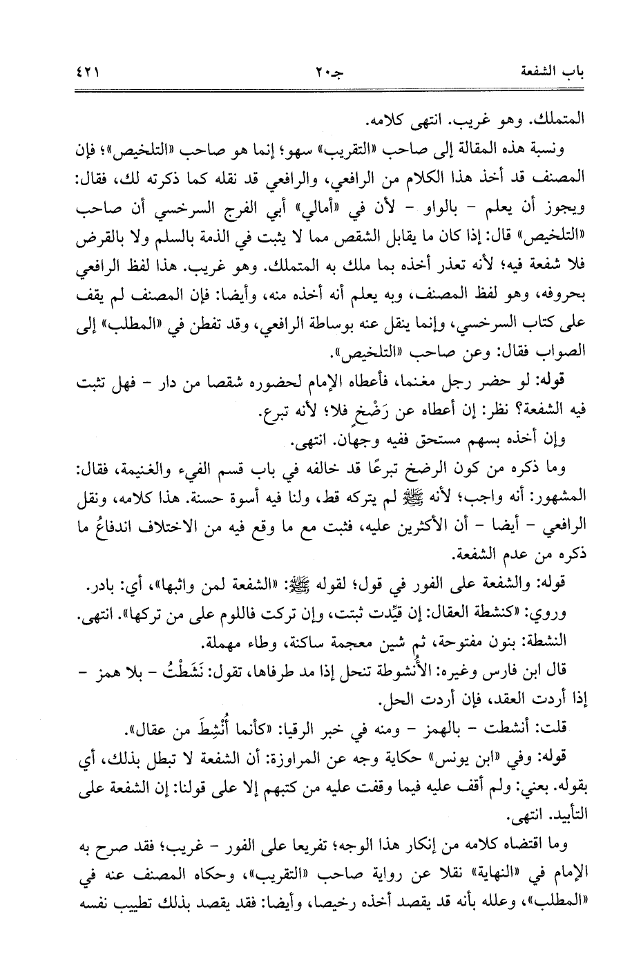 ونسبة هذه المقالة إلى صاحب ((التقريب)) سهو، إنما هو صاحب ((التلخيص))، فإن المصنف قد أخذ هذا الكلام من الرافعي، والرافعي قد نقله كما ذكرته لك، فقال: ويجوز أن يعلم- بالواو- لأن في ((أمالي)) أبي الفرج السرخسي أن صاحب ((التلخيص)) قال: إذا كان ما يقابل الشقص مما لا يثبت في الذمة بالسلم ولا بالقرض فلا شفعة فيه، لأنه تعذر أخذه بما ملك به المتملك. وهو غريب. هذا لفظ الرافعي بحروفه، وهو لفظ المصنف، وبه يعلم أنه أخذه منه، وأيضًا: فإن المصنف لم يقف على كتاب السرخسي، وإنما ينقل عنه بوساطة الرافعي، وقد تفطن في ((المطلب)) إلى الصواب فقال: وعن صاحب ((التلخيص)).