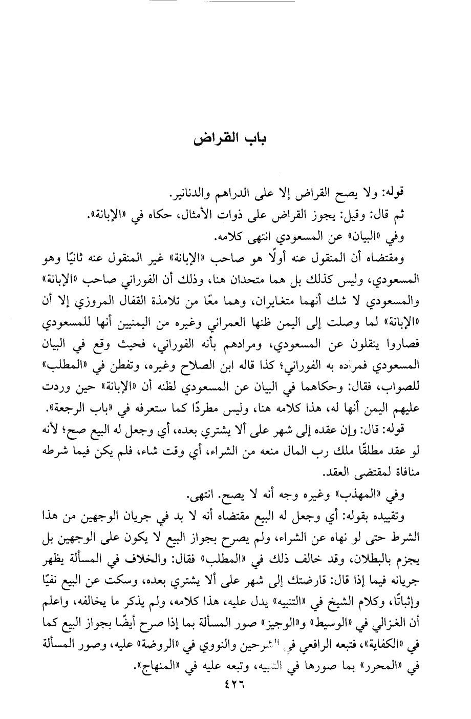 ثم قال: وقيل: يجوز القراض على ذوات الأمثال، حكاه في ((الإبانة)). وفي ((البيان)) عن المسعودي انتهى كلامه.