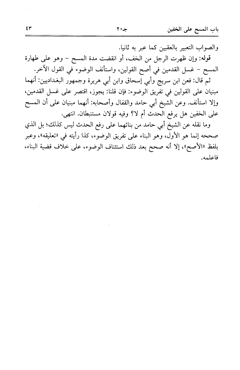 ثم قال: فعن ابن سريج وأبي إسحاق وابن أبي هريرة وجمهور البغداديين: أنهما مبنيان على القولين في تفريق الوضوء: فإن قلنا: يجوز، اقتصر على غسل القدمين، وإلا استأنف. وعن الشيخ أبي حامد والقفال وأصحابه: أنهما مبنيان على أن المسح على الخفين هل يرفع الحدث أم لا؟ وفيه قولان مستنبطان. انتهى.