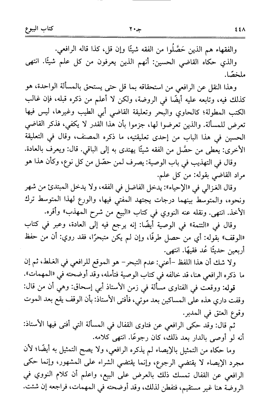 وقال في ((التتمة)) في الوصية أيضًا: إنه يرجع فيه إلى العادة، وعبر في كتاب ((الوقف)) بقوله: أي من حصل طرفًا، وإن لم يكن متبحرًا، فقد روي: أن من حفظ أربعين حديثًا عد فقيهًا. انتهى.