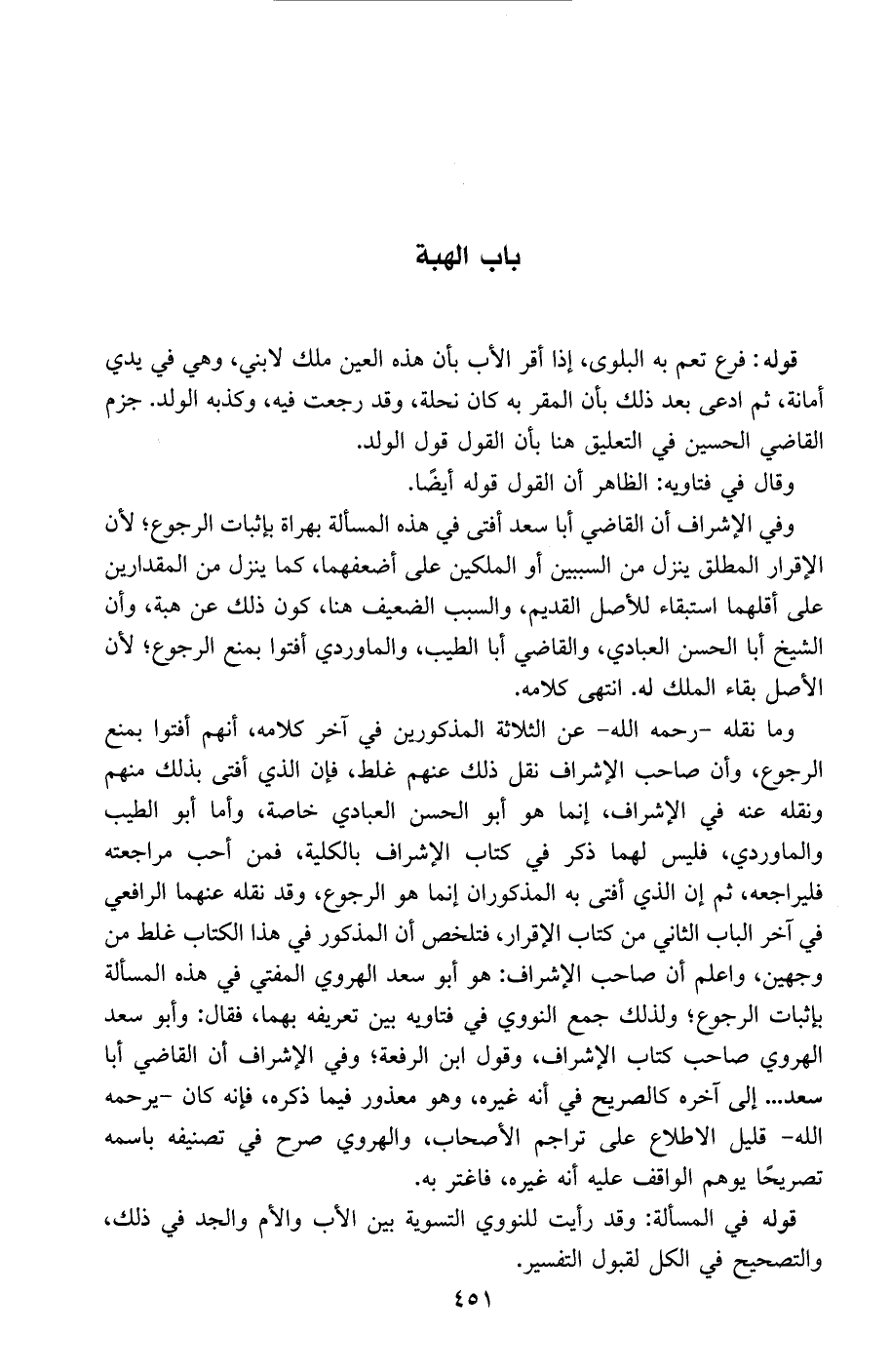 وما نقله- رحمه الله- عن الثلاثة المذكورين في آخر كلامه، أنهم أفتوا بمنع الرجوع، وأن صاحب الإشراف نقل ذلك عنهم غلط، فإن الذي أفتى بذلك منهم ونقله عنه في الإشراف، إنما هو أبو الحسن العبادي خاصة، وأما أبو الطيب والماوردي، فليس لهما ذكر في كتاب الإشراف بالكلية، فمن أحب مراجعته، ثم إن الذي أفتى به المذكوران إنما هو الرجوع، وقد نقله عنهما الرافعي في آخر الباب الثاني من كتاب الإقرار، فتلخص أن المذكور في هذا الكتاب غلط من وجهين، واعلم أن صاحب الإشراف: هو أبو سعد الهروي المفتي في هذه المسألة بإثبات الرجوع، ولذلك جمع النووي في فتاويه بين تعريفه بهما، فقال: وأبو سعد الهروي صاحب كتاب الإشراف، وقول ابن الرفعة، وفي الإشراف أن القاضي أبا سعد ... إلى آخره كالصريح في أنه غيره، وهو معذور فيما ذكره، فإنه كان- يرحمه الله- قليل الاطلاع على تراجم الأصحاب، والهروي صرح في تصنيفه باسمه تصريحًا يوهم الواقف عليه أنه غيره، فاغتر به.