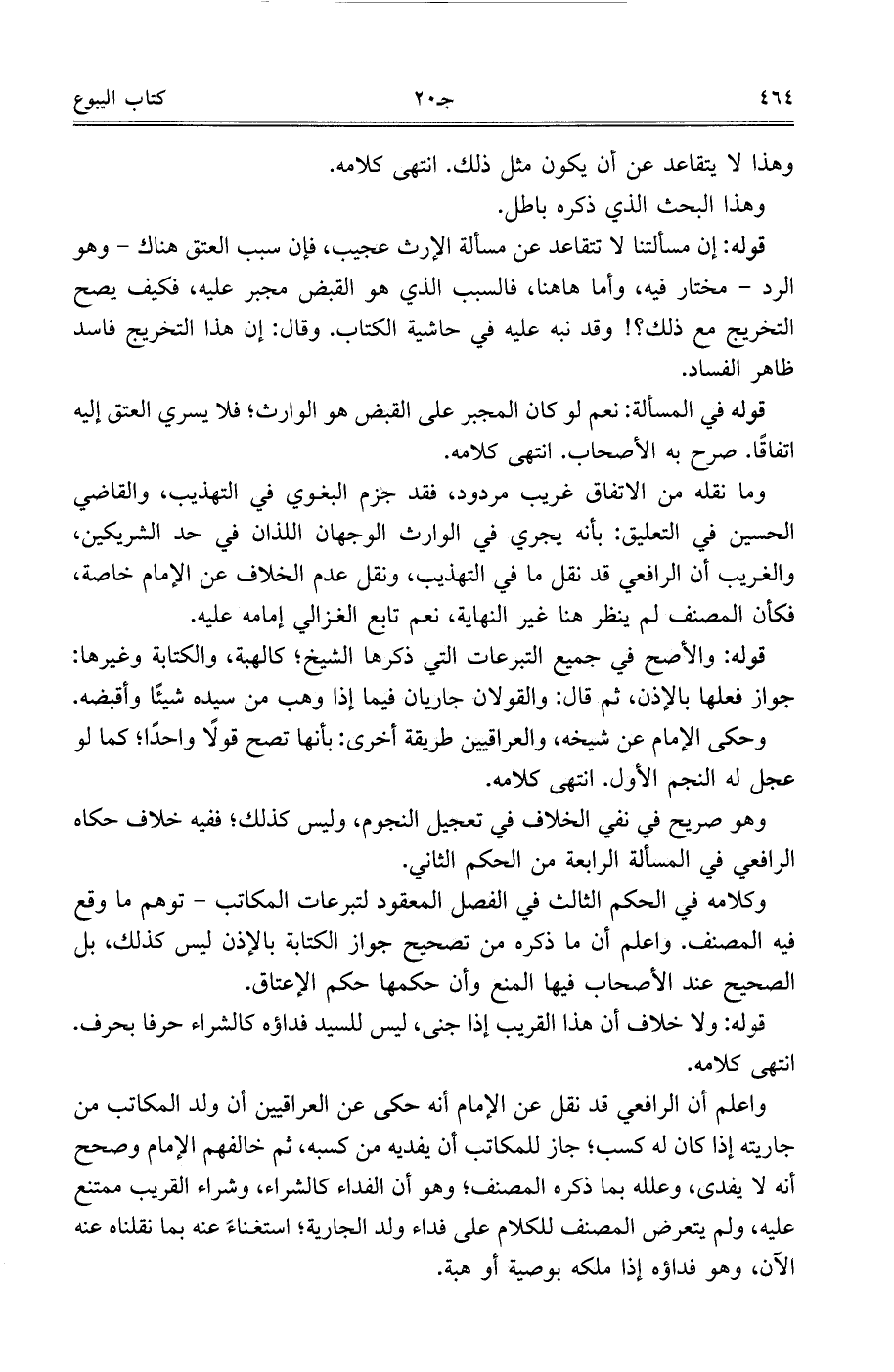 قوله: إن مسألتنا لا تتقاعد عن مسألة الإرث عجيب، فإن سبب العتق هناك- وهو الرد- مختار فيه، وأما هاهنا، فالسبب الذي هو القبض مجبر عليه، فكيف يصح التخريج مع ذلك؟! وقد نبه عليه في حاشية الكتاب. وقال: إن هذا التخريج فاسد ظاهر الفساد.