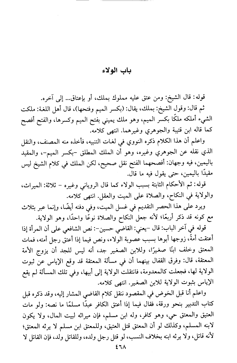 واعلم أنا قبل الخوض في المقصود ننقل كلام القاضي المشار إليه، وقد ذكره قبل كتاب التدبير بنحو ورقة، فقال فيما إذا أعتق الكافر عبدًا مسلمًا ما نصه: ولو مات العتيق والمعتق حي، وهو كافر، وله ابن مسلم، فإن ميراثه لبيت المال، ولا يكون لابنه المسلم، وكذلك لو أن المعتق قتل العتيق، وللمعتق ابن مسلم لا يرثه المعتق، لأنه قاتل، ولا يرثه ابنه بخلاف النسب، لو قتل رجل ولده، وللقائل ولد، فإن القاتل لا