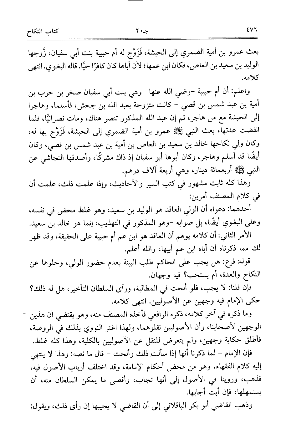 أحدهما: دعواه أن الولي العاقد هو الوليد بن سعيد، وهو غلط محض في نفسه، وعلى البغوي أيضًا، بل صوابه- وهو المذكور في التهذيب، إنما هو خالد بن سعيد.