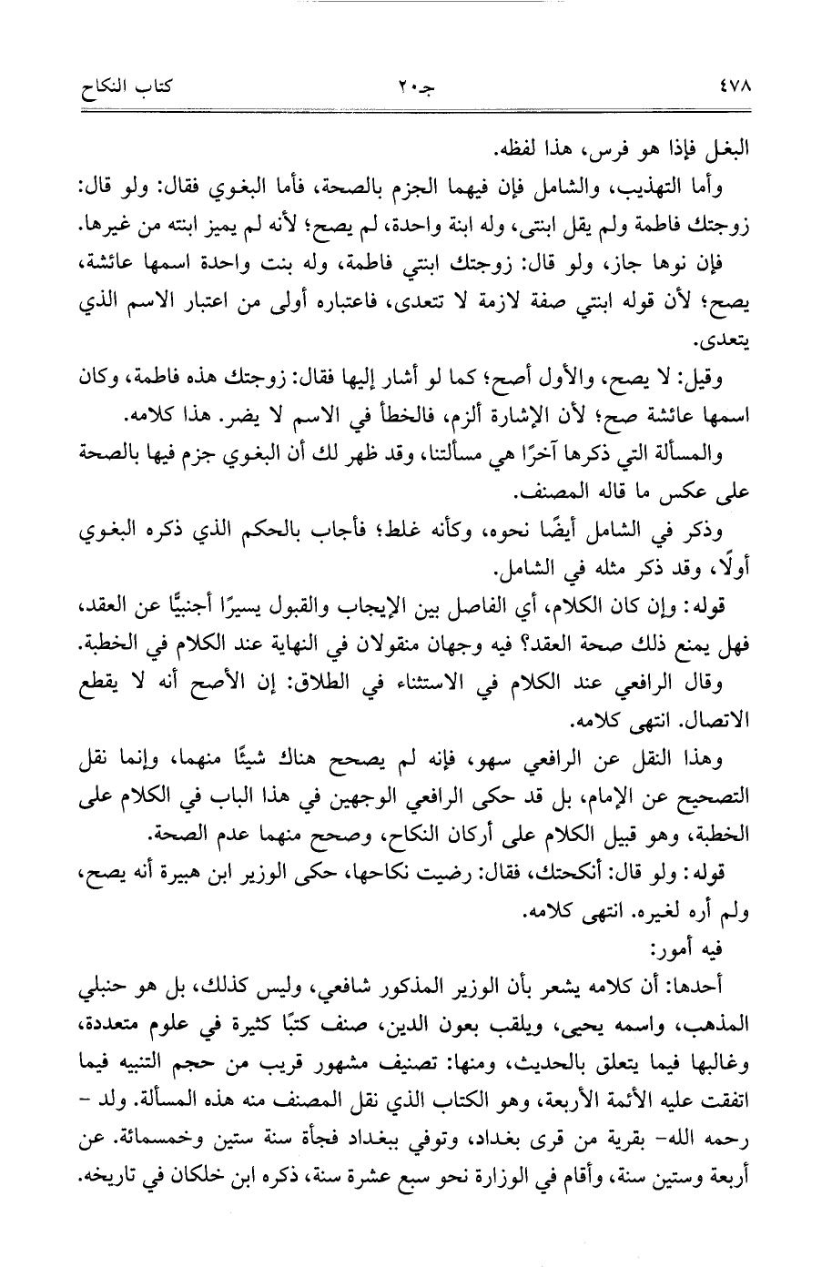 أحدها: أن كلامه يشعر بأن الوزير المذكور الشافعي، وليس كذلك، بل هو حنبلي المذهب، واسمه يحيي، ويلقب بعون الدين، صنف كتبًا كثيرة في علوم متعددة، وغالبها فيما يتعلق بالحديث، ومنها: تصنيف مشهور قريب من حجم التنبيه فيما اتفقت عليه الأئمة الأربعة، وهو الكتاب الذي نقل المصنف منه هذه المسألة. ولد- رحمه الله- بقرية من قرى بغداد، وتوفي ببغداد فجأة سنة ستين وخمسمائة. عن أربعة وستين سنة، وأقام في الوزارة نحو سبع عشرة سنة، ذكره ابن خلكان في تاريخه.
