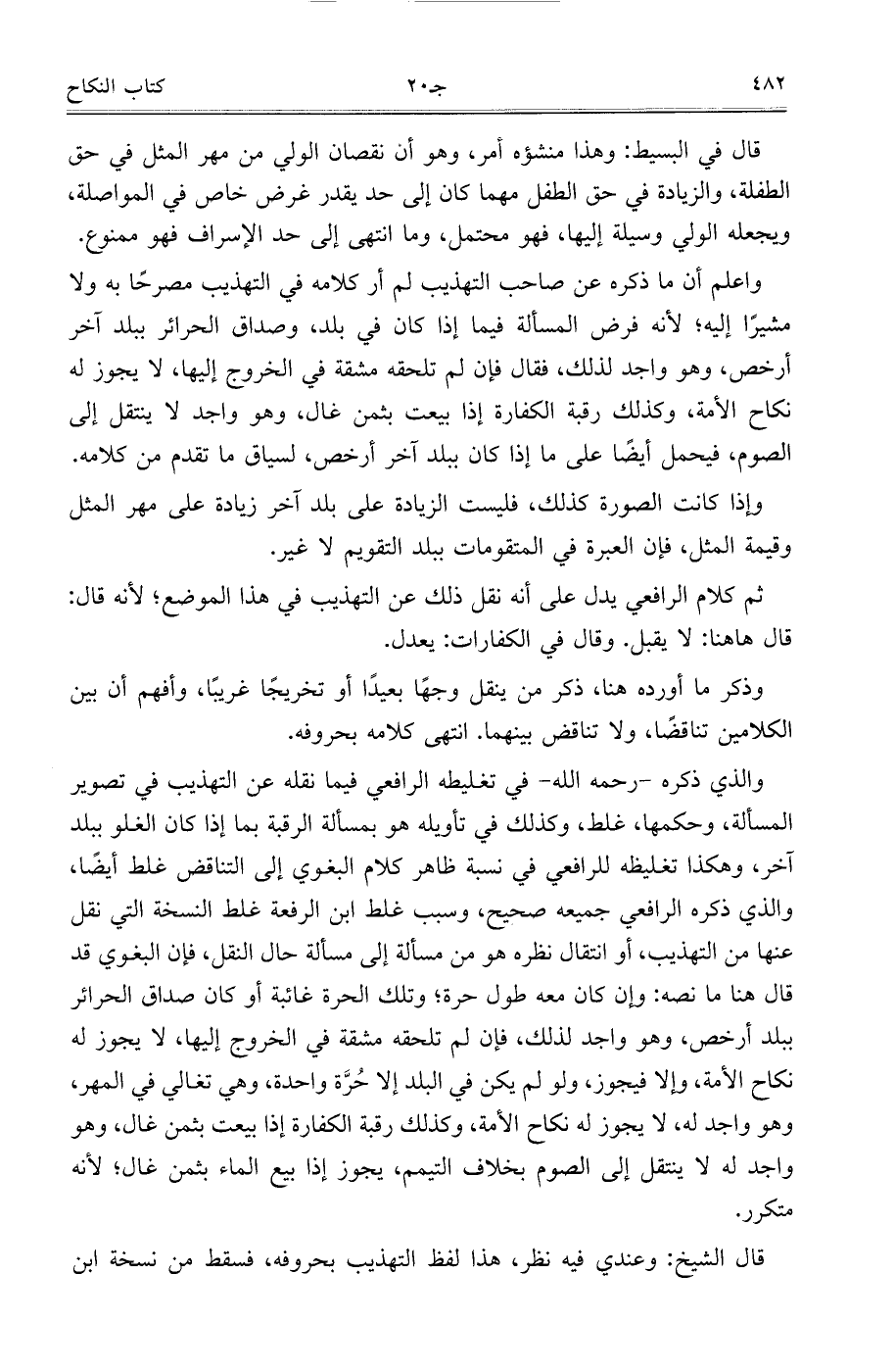 قال الشيخ: وعندي فيه نظر، هذا لفظ التهذيب بحروفه، فسقط من نسخة ابن