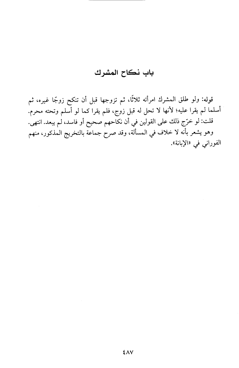 قوله: ولو طلق المشرك امرأته ثلاثًا، ثم تزوجها قبل أن تنكح زوجًا غيره، ثم أسلما لم يقرا عليه، لأنها لم تحل له قبل زوج، فلم يقرا كما لو أسلم وتحته محرم.