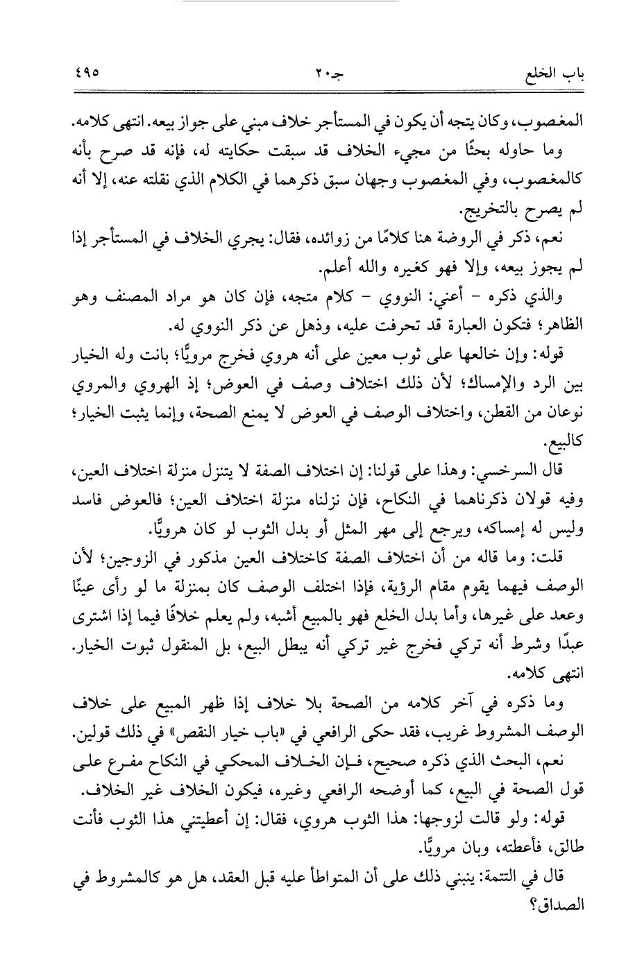 والذي ذكره- أعني: النووي- كلام متجه، فإن كان هو مراد المصنف وهو الظاهر، فتكون العبارة قد تحرفت عليه، وذهل عن ذكر النووي له.