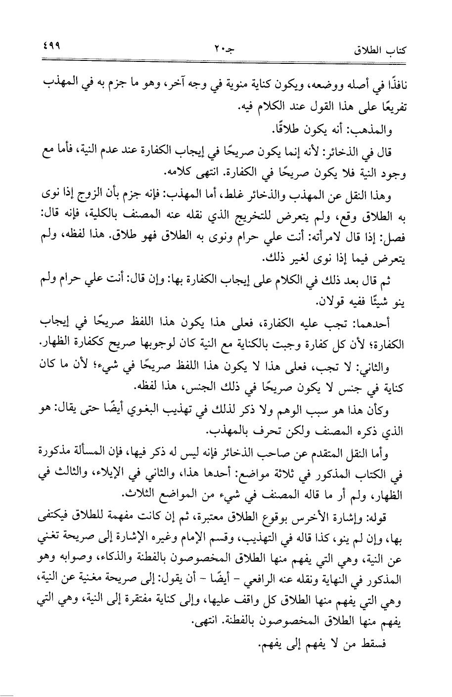 وهذا النقل عن المهذب والذخائر غلط، أما المهذب: فإنه جزم بأن الزوج إذا نوى به الطلاق وقع، ولم يتعرض للتخريج الذي نقله عنه المصنف بالكلية، فإنه قال: فصل: إذا قال لامرأته: أنت علي حرام ونوى به الطلاق فهو طلاق. هذا لفظه، ولم يتعرض فيما إذا نوى لغير ذلك.