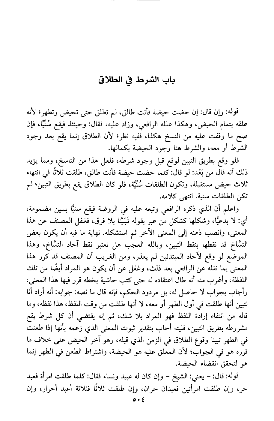 واعلم أن الذي ذكره الرافعي وتبعه عليه في الروضة فيقع سنيًا بسين مضمومة، أي: لا بدعيًا، وشكلها كشكل من عبر بقوله تبنيًا بلا فرق، فغفل المصنف عن هذا المعنى، وانصب ذهنه إلى المعنى الآخر ثم استشكله. نهاية ما فيه أن يكون بعض النساخ قد نقطها بنقط التبين، ويالله العجب هل تعتبر نقط آحاد النساخ، وهذا الموضع لو وقع لآحاد المبتدئين لم يعذر، ومن الغريب أن المصنف قد كرر هذا المعنى بما نقله عن الرافعي بعد ذلك، وغفل عن أن يكون هو المراد أيضًا من تلك اللفظة، وأغرب منه أنه طال اعتقاده له حتى كتب حاشية بخطه قرر فليها هذا المعنى، وأجاب بجواب لا حاصل له، بل مردود الحكم، فإنه قال ما نصه: جوابه: أنه أراد أنا نتبين أنها طلقت في أول الطهر أو معه، لا أنها طلقت من وقت اللفظ، هذا لفظه، وما قاله من انتفاء إرادة اللفظ فهو المراد بلا شك، ثم إنه يقتضي أن كل شرط يقع مشروطه بطريق التبين، فليته أجاب بتقدير ثبوت المعنى الذي زعمه بأنها إذا طعنت في الطهر تبنيا وقوع الطلاق في الزمن الذي قبله، وهو آخر الحيض على خلاف ما قرره هو في الجواب، لأن المعلق عليه هو الحيضة، واشتراط الطعن في الطهر إنما هو لتحقق انقضاء الحيضة.