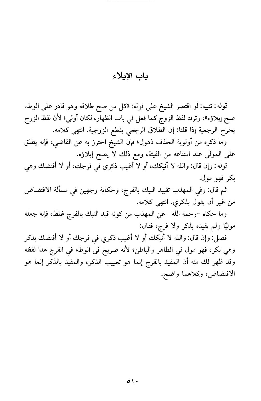 فصل: وإن قال: والله لا أنيكك أو لا أغيب ذكري في فرجك أو لا أفتضك بذكر وهي بكر، فهو مول في الظاهر والباطن، لأنه صريح في الوطء في الفرج هذا لفظه وقد ظهر لك منه أن المقيد بالفرج إنما هو تغييب الذكر، والمقيد بالذكر إنما هو الافتضاض، وكلاهما واضح.