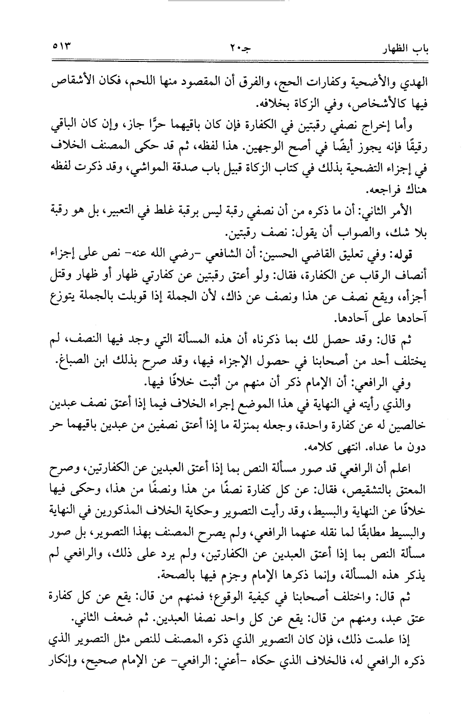 وأما إخراج نصفي رقبتين في الكفارة فإن كان باقيهما حرًّا جاز، وإن كان الباقي رقيقًا فإنه يجوز أيضًا في أصح الوجهين. هذا لفظه، ثم قد حكى المصنف الخلاف في إجزاء التضحية بذلك في كتاب الزكاة قبيل باب صدقة المواشي، وقد ذكرت لفظه هناك فراجعه.