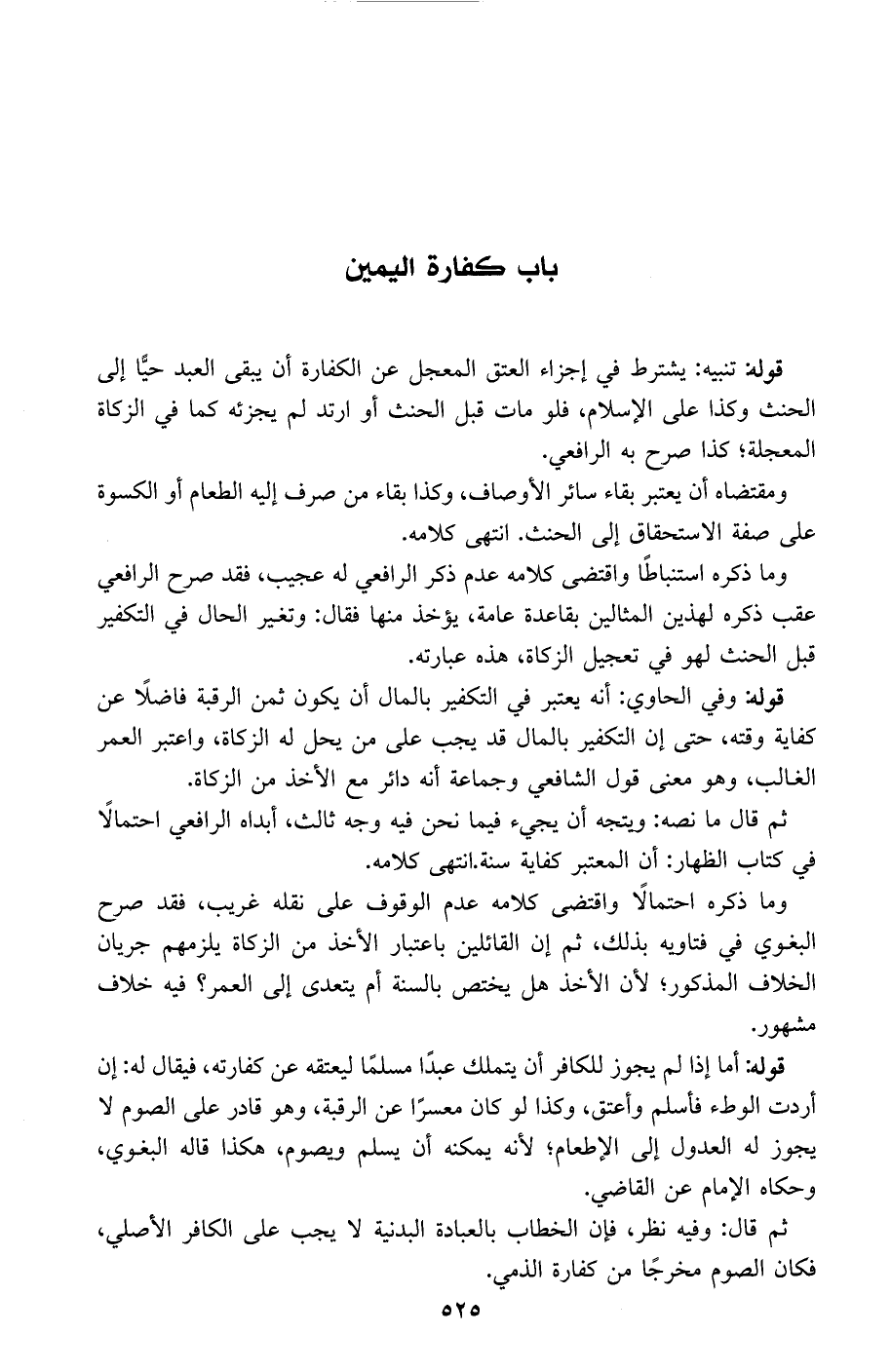 قوله: تنبيه: يشترط في إجزاء العتق المعجل عن الكفارة أن يبقى العبد حيًا إلى الحنث وكذا على الإسلام، فلو مات قبل الحنث أو ارتد لم يجزئه كما في الزكاة المعجلة، كذا صرح به الرافعي.