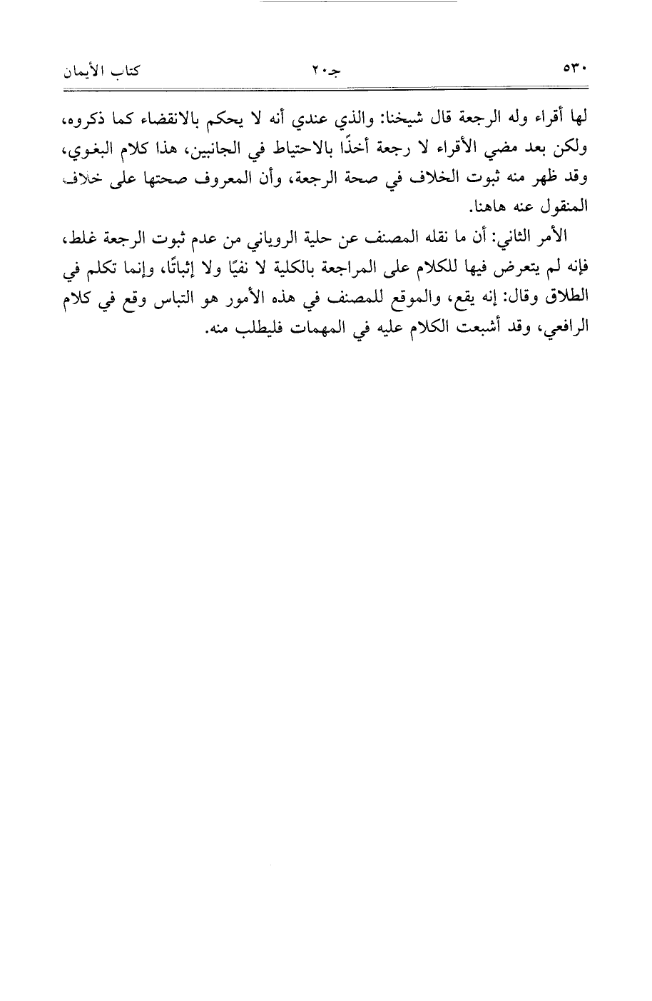 الأمر الثاني: أن ما نقله المصنف عن حلية الروياني من عدم ثبوت الرجعة غلط، فإنه لم يتعرض فيها للكلام على المراجعة بالكلية لا نفيًا ولا إثباتًا، وإنما تكلم في الطلاق وقال: إنه يقع، والموقع للمصنف في هذه الأمور هو التباس وقع في كلام الرافعي، وقد أشبعت الكلام عليه في المهمات فليطلب منه.