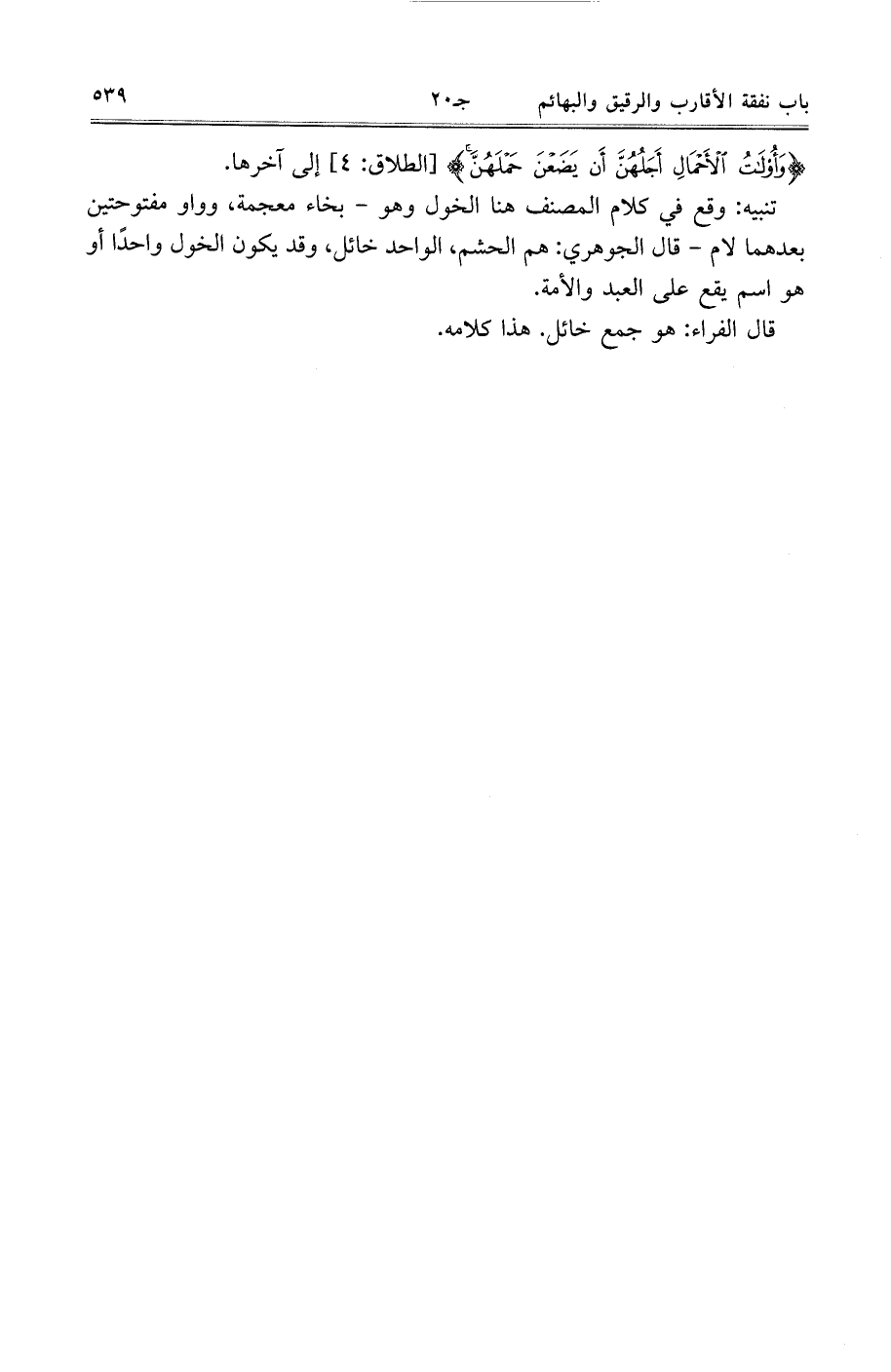 تنبيه: وقع في كلام المصنف هنا الخول وهو- بخاء معجمة، وواو مفتوحتين بعدهما لام- قال الجوهري: هم الحشم، الواحد خائل، وقد يكون الخول واحدًا أو اسم يقع على العبد والأمة.