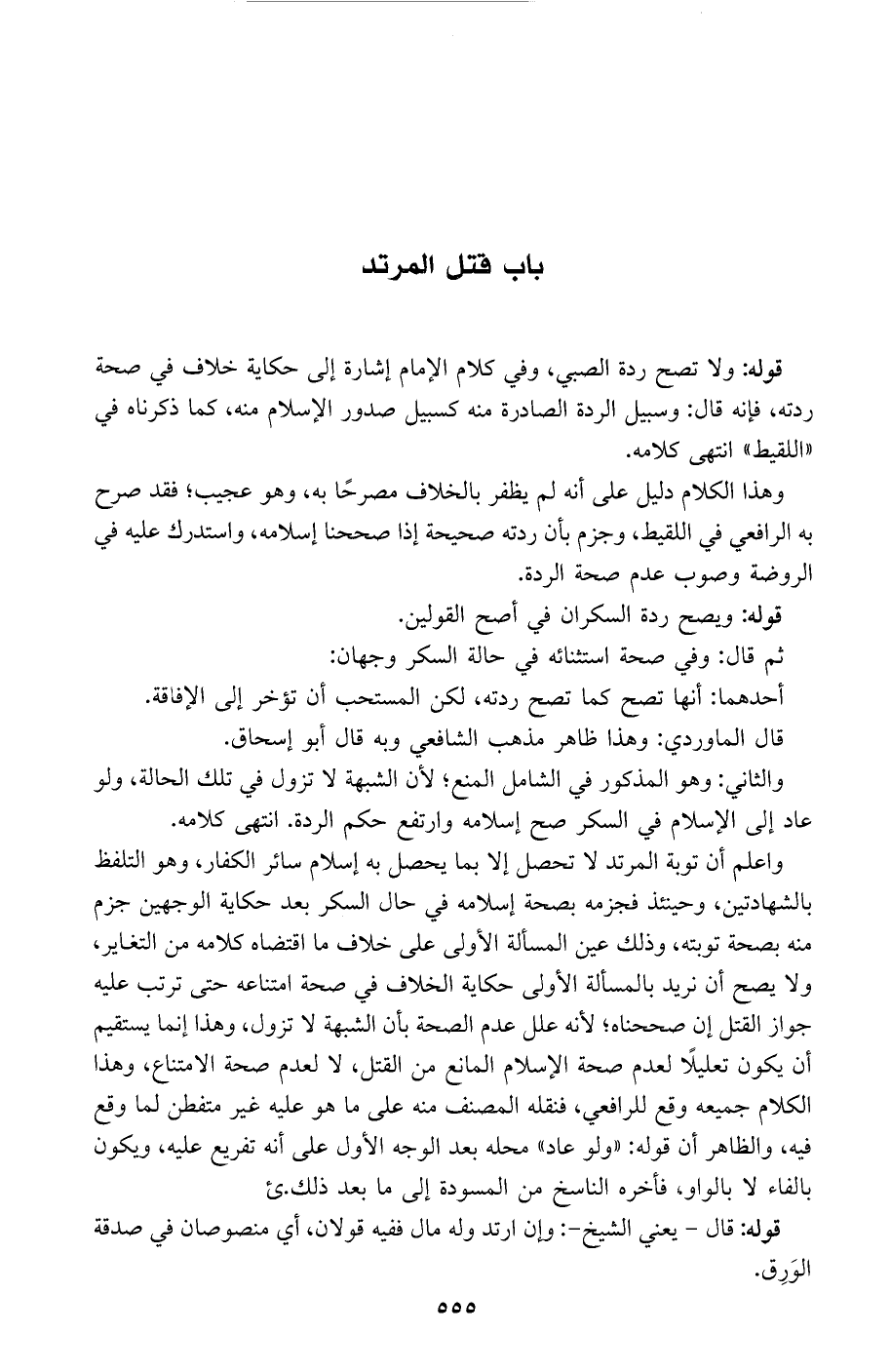 قوله: ولا تصح ردة الصبي، وفي كلام الإمارة إشارة إلى حكاية خلاف في صحة ردته، فإنه قال: وسبيل الردة الصادرة منه كسبيل صدور الإسلام منه، كما ذكرناه في ((اللقيط)) انتهى كلامه.