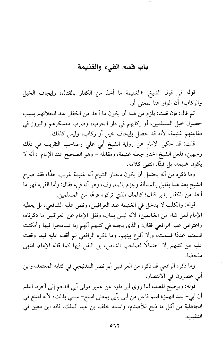 قوله: في قول الشيخ: ((الغنيمة ما أخذ من الكفار بالقتال، وإيجاف الخيل والركاب)) أن الواو هنا بمعنى أو.