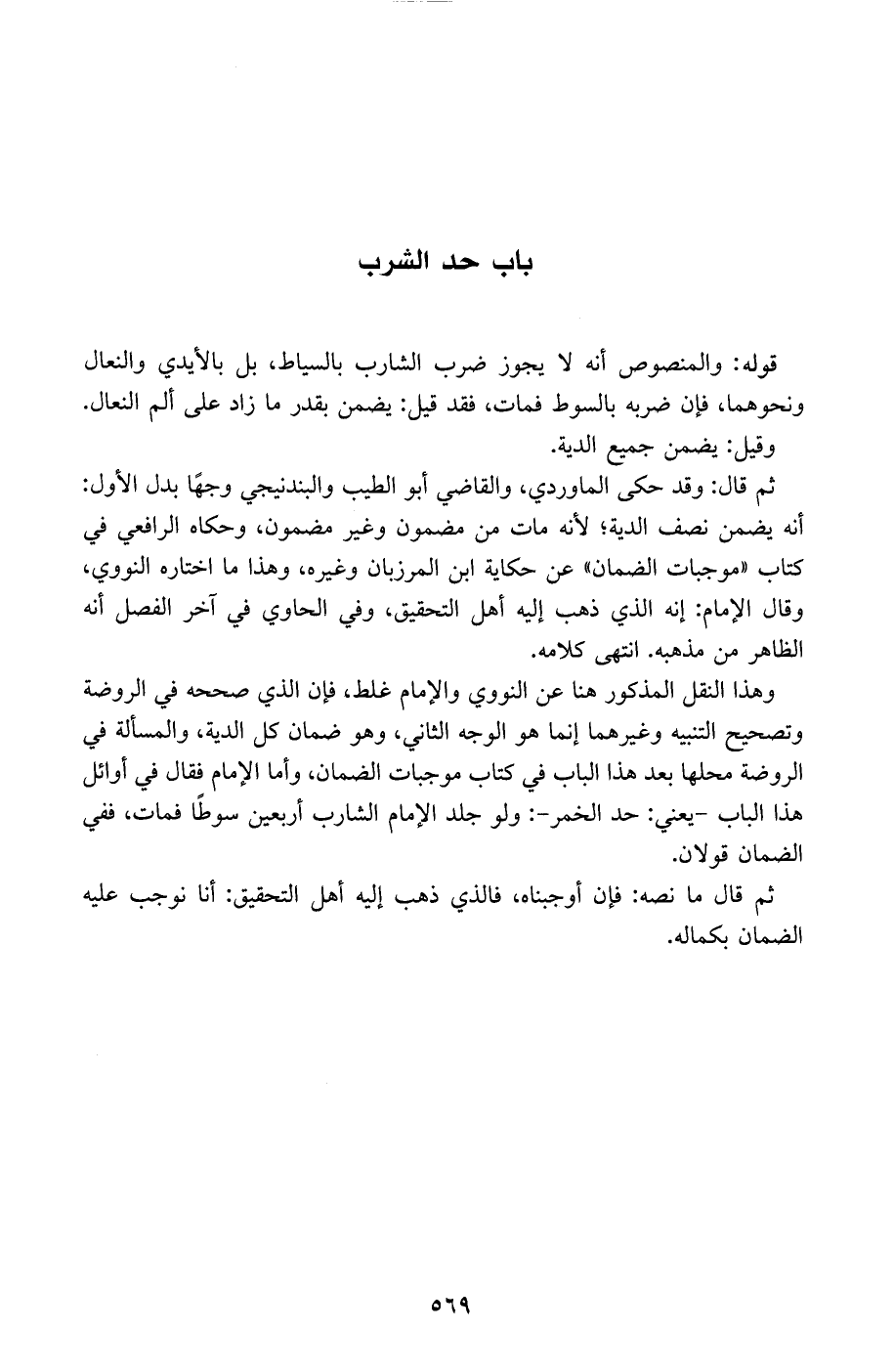 قوله: والمنصوص أنه لا يجوز ضرب الشارب بالسياط، بل بالأيدي والنعال ونحوهما، فإن ضربه بالسوط فمات، فقد قيل: يضمن بقدر ما زاد على ألم النعال.