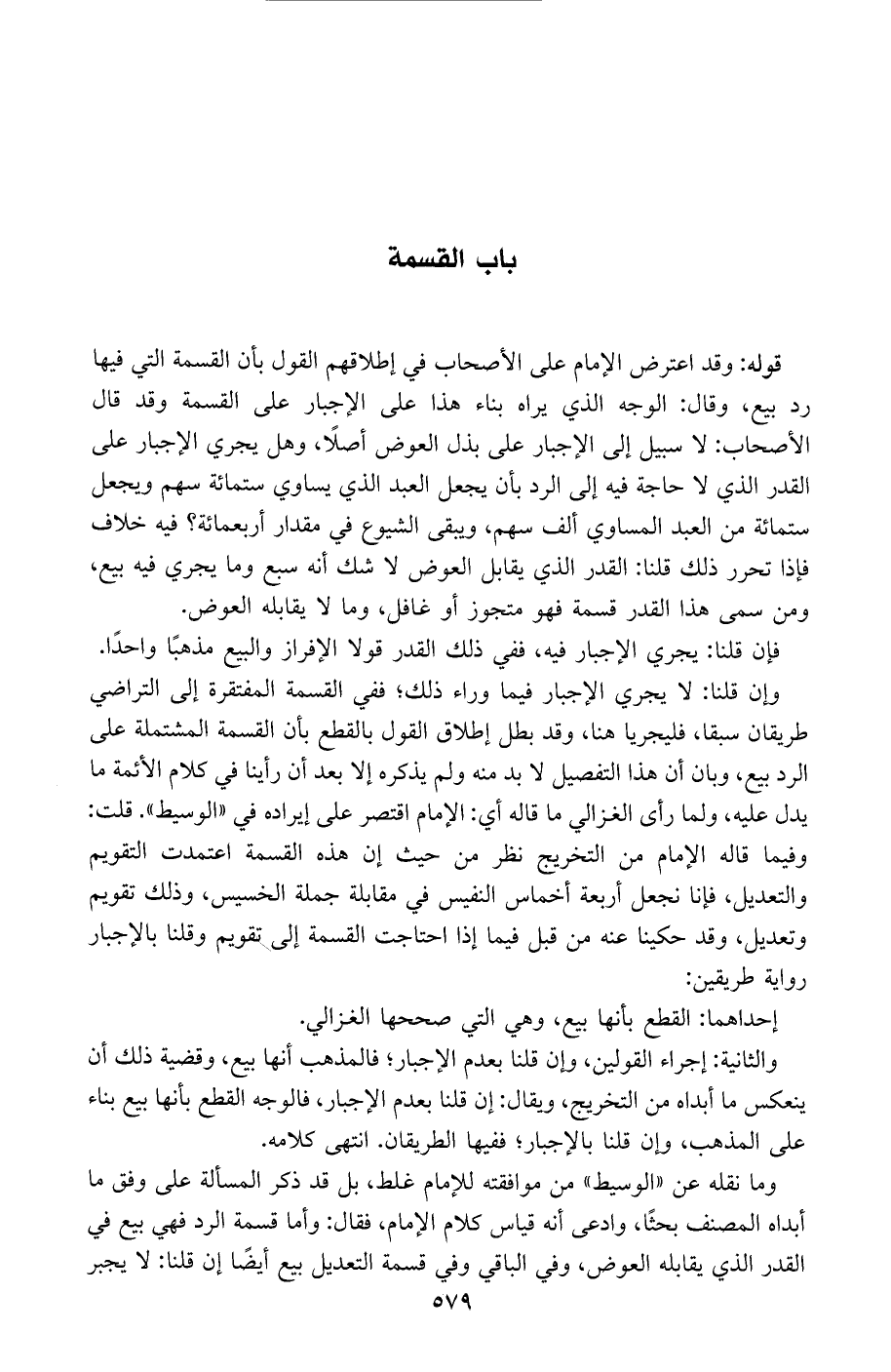 قوله: وقد اعترض الإمام على الأصحاب في إطلاقهم القول بأن القسمة التي فيا رد بيع، وقال: الوجه الذي يراه بناء هذا على الإجبار على القسمة وقد قال الأصحاب: لا سبيل إلى الإجبار على بذلك العوض أصلًا، وهل يجري الإجبار على القدر الذي لا حاجة فيه إلى الرد بأن يجعل العبد الذي يساوي ستمائة سهم ويجعل ستمائة من العبد المساوي ألف سهم، ويبقى الشيوع في مقدار أربعمائة؟ فيه خلاف فإذا تحرر ذلك قلنا: القدر الذي يقابل العوض لا شك أنه سبع وما يجري فيه بيع، ومن سمى هذا القدر قسمة فهو متجوز أو غافل، وما لا يقابله العوض.