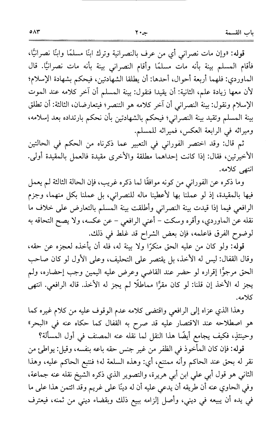 وما ذكره عن الفوراني من كونه موافقًا لما ذكره غريب، فإن الحالة الثالثة لم يعمل فيها بالمقيدة، إذ لو عملنا بها لأعطينا ماله للنصراني، بل علمنا بكل منهما، وجزم الرافعي فيما إذا قيدت بينة النصراني وأطلقت بينة المسلم بالتعارض على خلاف ما نقله عن الماوردي، وأقره وسكت- أعني الرافعي- عن عكسه، ولا يصح التحاقه به لوضوح الفرق فاعلمه، فإن بعض الشراح قد غلط في ذلك.