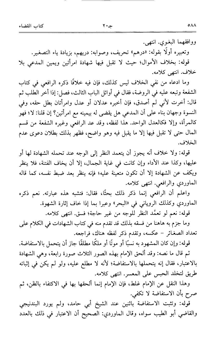 وما ادعاه من نفي الخلاف ليس كذلك، فإن فيه خلافًا ذكره الرافعي في كتاب الشفعة وتبعه عليه في الروضة، فقال في أوائل الباب الثالث، فصل: إذا أخر الطلب ثم قال: أخرت لأني لم أصدق، فإن أخبره عدلان أو عدل وامرأتان بطل حقه، وفي النسوة وجهان بناء على أن المدعي هل يقضي له بيمينه مع امرأتين؟ إن قلنا: لا، فهو كالمرأة، وإلا فكالعدل الواحد. هذا لفظه، وقد عد الرافعي وغيره الشفعة من قسم المال حتى لا تقبل إلا ما يقبل فيه وهو واضح، فظهر بذلك بطلان دعوى عدم الخلاف.
