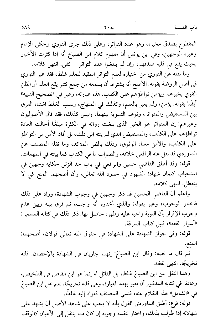 وما نقله عن النووي من اختياره لعدم التواتر المقيد للعلم غلط، فقد عبر النووي في أصل الروضة بقوله: الأصح أنه يشترط أن يسمعه من جميع كثير يقع العلم أو الظن القوي بخبرهم ويؤمن تواطؤهم على الكذب. هذه عبارته، وعبر في ((تصحيح التنبيه)) أيضًا بقوله: يؤمن، ولم يعبر بالعلم، وكذلك في المنهاج، وسبب الغلط اشتباه الفرق بين المستفيض والمتواتر، وتوهم التسوية بينهما، وليس كذلك، فقد قال الأصوليون وغيرهم: إن المتواتر هو الخبر الذي بلغت رواته في الكثرة مبلغًا أحالت العادة تواطؤهم على الكذب، والمستفيض الذي لم ينته إلى ذلك، بل أفاد الأمن من التواطؤ على الكذب، والأمن معناه الوثوق، وذلك بالظن المؤكد، وما نقله المصنف عن الماوردي قد نقل عنه الرافعي خلافه، والصواب ما في الكتاب كما بينته في المهمات.